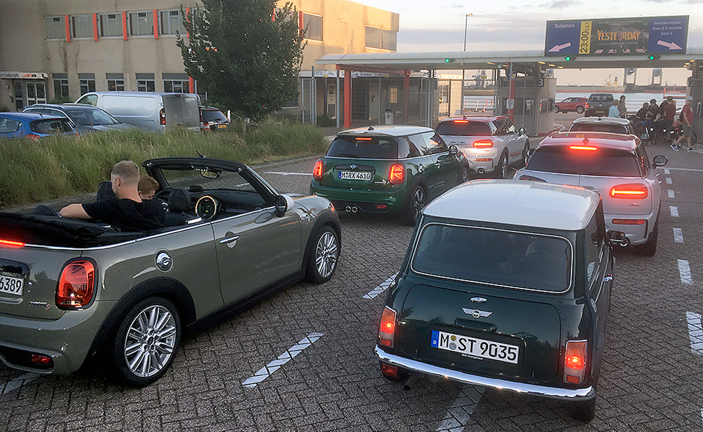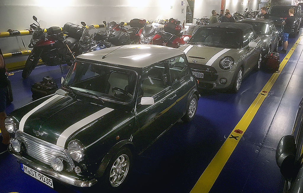 In unserem Mini, dessen Sportsitze selbst auf längerer Strecke gar nicht so unkomfortabel sind und dessen Raumangebot sich für einen Wagen dieser Größe durchaus sehen lassen kann, geht es weiter an Mönchengladbach vorbei. Bei Venlo erreichen wir die Niederlande, biegen bei Gelderland westlich Richtung Scheveningen ab. Von Frankfurt bis zur Fähre zeigt der Bordcomputer rund 500 Kilometer an. Unter Deck im Bauch des Schiffs diverse Mini-Oldtimer. Wir sind in historischer Begleitung! Auf der anderen Seite des Kanals führt uns die Strecke am nächsten Morgen über vier Stunden an Essex, Brentwood, London, Oxford und Shipton Olife vorbei nach Bristol.