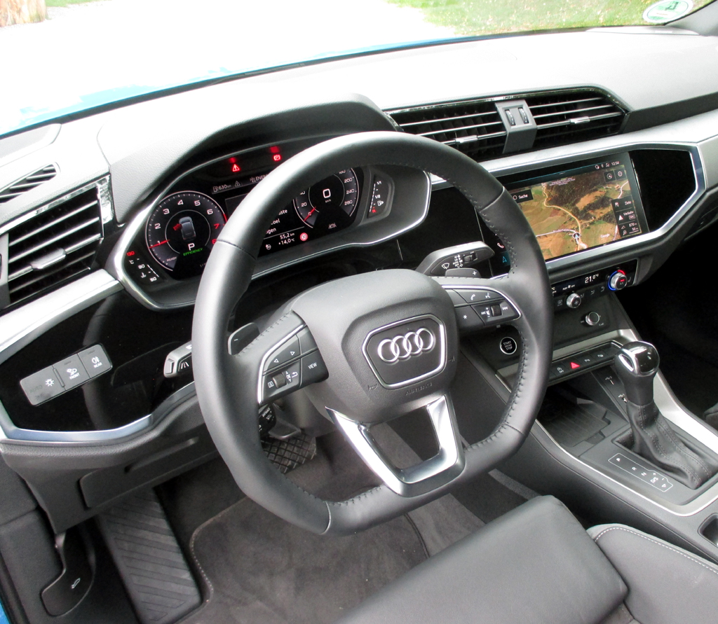 Das Auto: Das neue Modell, sauber verarbeitet, wertig anmutend, 4,50 Meter lang, Radstand 2,68 Meter, Kofferraum 530 bis 1400 Liter, kommt länger als der normale, ab 34 400 Euro teure Q3 daher, auf dem er basiert, baut flacher und schmaler. Auffällig außen ist die coupéhaft nach hinten abfallende obere Linienführung des fünftürigen Fünfsitzers, die in einem Dachkantenspoiler endet. Spezielle Designelemente wie die keilförmig nach innen verlaufenden Leuchten, der achteckige Kühlergrill mit schwarzem Gitter, trapezförmige Lufteinlässe oder der Stoßfänger mit flachem Blade wirken wie das gesamte Heck eher in die Breite. Markante Anbauteile, in Kontrastfarbe lackiert, weisen auf SUV- und Quattro-Charakter hin. Innen geht es variabel zu. Die Rückbank lässt sich längs verschieben. Man sitzt höher. Selbst im Fond ist noch ganz ordentlich Platz vorhanden. Bloß die Sicht nach hinten ist etwas eingeschränkt. Im sportlich-funktionellen Cockpit setzen die Ingolstädter beim Bedien- und Anzeigenkonzept auf Digitalisierung.