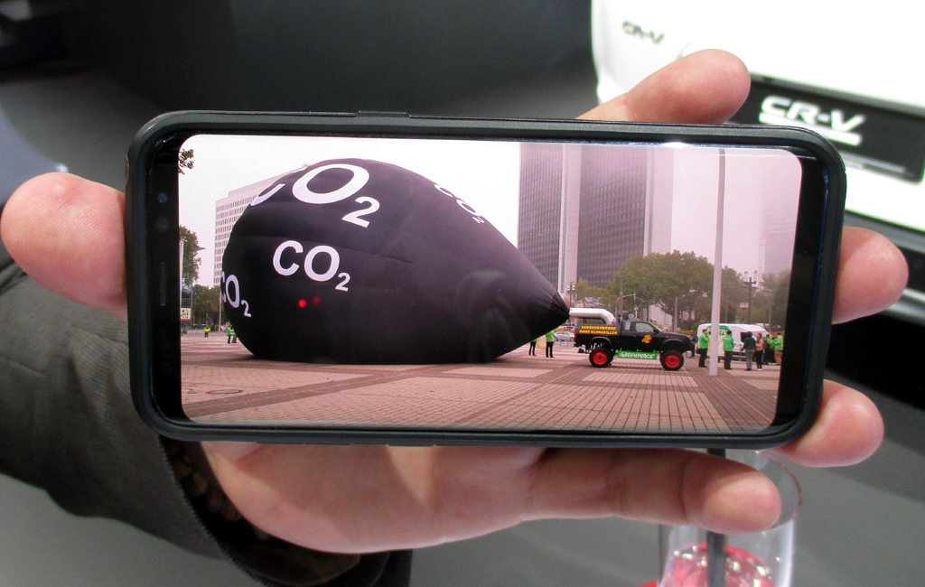 Frankfurt/Main – Da braut sich was zusammen! Erster Medientag bei der Internationalen Automobil-Ausstellung (IAA) für Pkw noch bis zum 22. September in Frankfurt/Main, Motto „Driving tomorrow“, also wie wir morgen fahren. Am City-Eingang der Messe haben Greenpeace-Umweltaktivisten bereits einen hochgebockten Pickup mit der Aufschrift „Verkehrswende ohne Klimakiller“ in Position gebracht, lassen die Abgase des Wagens über ein Ofenrohr einen schwarzen Riesenballon füllen, auf dem groß die CO2-Abkürzung für das schädliche Treibhaus Kohlendioxid zu lesen ist.