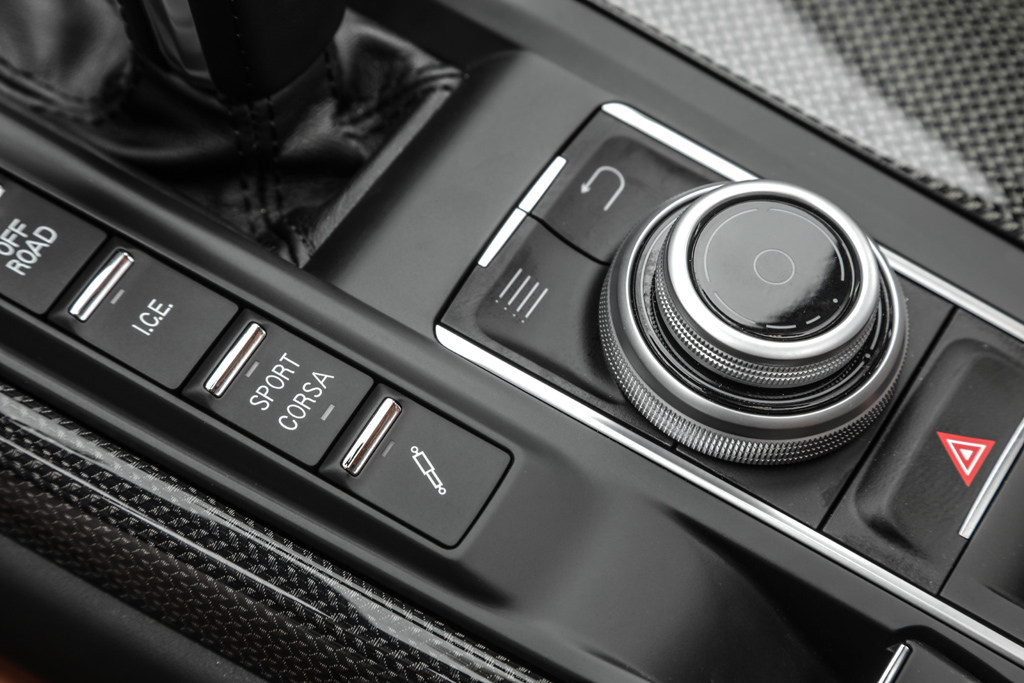 Bedienfeld mit Taste für zusätzlichen Corsa-Modus auf der Mittelkonsole. Heck-/Seitenansicht.