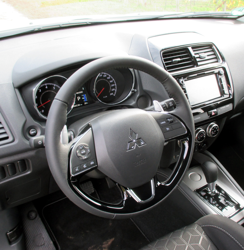 Der Antrieb: Den bisherigen 1,6-Liter-Benziner haben die Japaner durch ein größeres, bereits aus dem Outlander bekanntes 2,0-Liter-Pendant ersetzt. Der nach der Abgasnorm Euro-6d-Temp freigegebene Vierzylinder leistet 150 PS, stellt im leer 1437 bis 1590 Kilo schweren ASX leider nur 195 Newtonmeter Drehmoment ab 4200 Touren zur Verfügung, beschleunigt ihn in 10,2 bis 12,2 Sekunden aus dem Stand auf Tempo 100, macht ihn in der Spitze 190 Stundenkilometer schnell, soll sich in Verbindung mit der Stopp/Start-Spritspartechnik im Mix beim Verbrauch mit 6,5 bis 7,3 Litern begnügen, zumindest laut Datenblatt. Ein Schaltgetriebe mit bloß fünf Gängen oder neu eine elektronisch gesteuerte Sechsstufen-CVT-Automatik übertragen die Kraft auf die vorderen oder auf alle vier Räder. Wir sind in einer der Einführungsauflagen mit Frontantrieb und CVT-Box unterwegs gewesen. Bei uns hat der Bordcomputer am Ende nach normalen Orts- und flotteren Landstraßenfahrprofilen 7,9 (statt maximal 6,8) Liter angezeigt.
