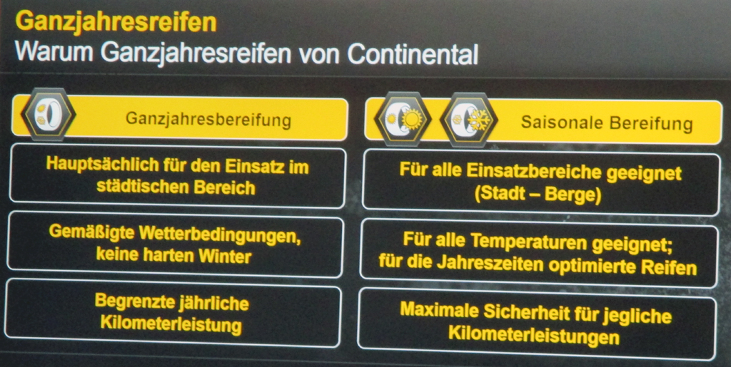 Zur Winterreifenpflicht in Europa: In Deutschland gilt sie situativ bei winterlichen Bedingungen. Im Ausland, nicht zuletzt im gebirgigeren, kann dies anders sein. Die Reifen sollten rechtzeitig montiert werden; von Oktober bis Mai ist laut Continental Winterreifenzeit, wobei als Faustregel „Von O(ktober) bis O(stern)“ gilt. Die Winterreifen sollten an allen Radpositionen montiert, neue rund 300 Kilometer eingefahren, gebrauchte auf Beschädigungen geprüft, Winterreifen unter vier Millimeter Restprofiltiefe im Sommer weiter gefahren werden, da sie sich für den Winter dann nicht mehr eigneten. Aufkleber sollten außerdem die maximal zulässige Geschwindigkeit anzeigen, falls die zulässige Reifengeschwindigkeit niedriger als die höchste des Fahrzeugs sei. Und wer weiter dazu beitragen will, im Winter sicherer unterwegs zu sein, nachdem man auch an den Frostschutz für Kühler und Scheibenwischwasser gedacht hat: Gefühlvoll Gas geben, raten die Hannoveraner, vorsichtig fahren, Abstand halten und abrupte Lenkbewegungen vermeiden!
