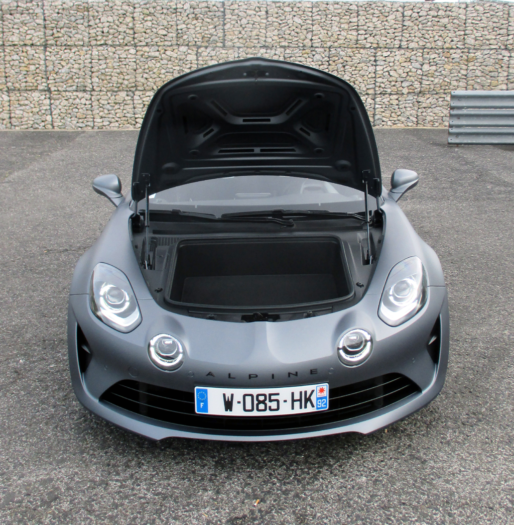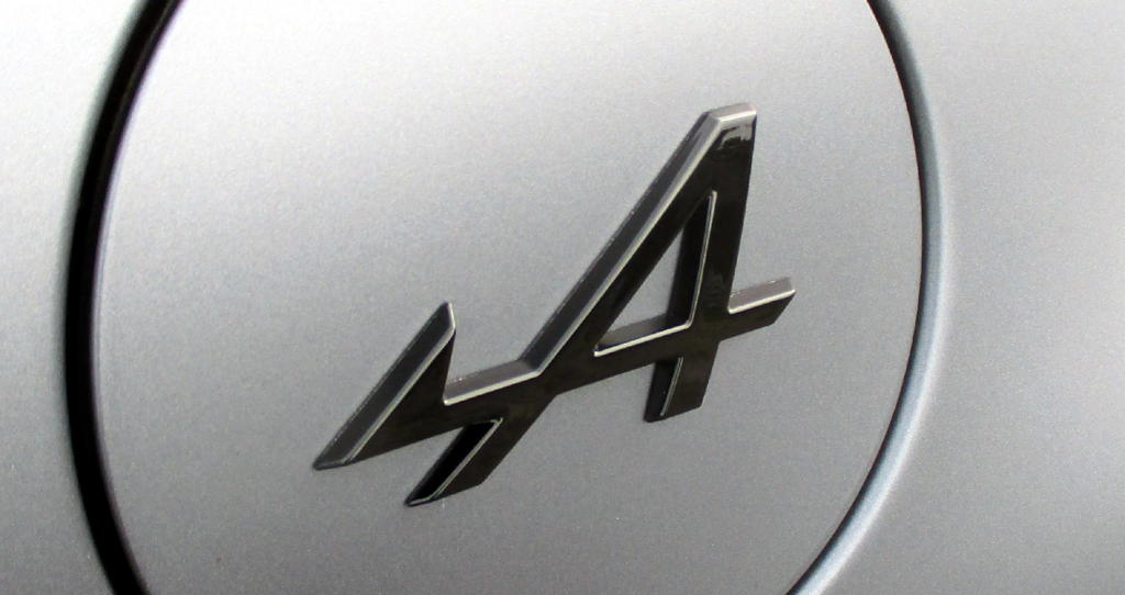 Blick auf die flache Frontpartie. Der Tankdeckel mit A(lpine)-Kürzel sitzt an der Seite vorn rechts.