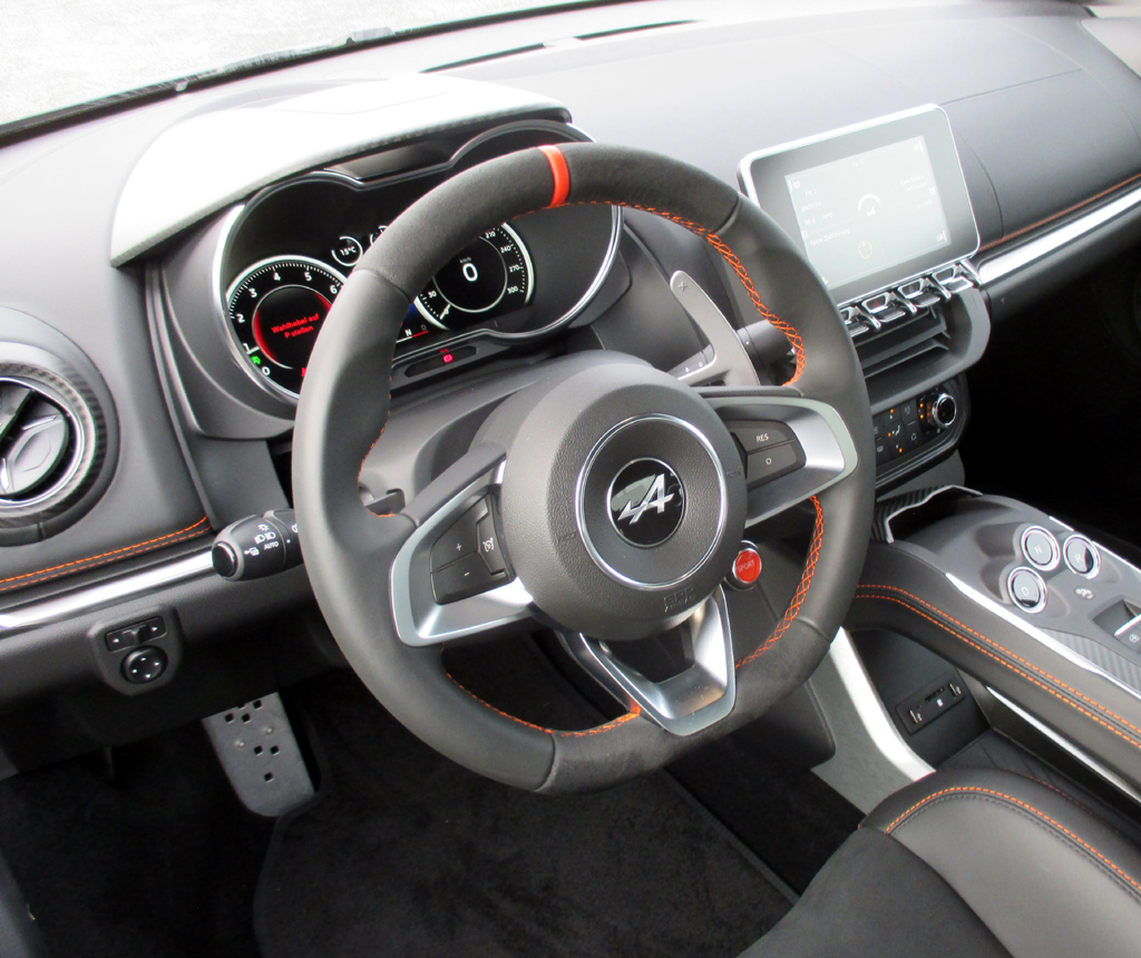 Das Fahren: Der Turbo schiebt den Alpine spritzig voran, vermittelt dabei ein überaus agiles Fahrgefühl, wozu neben kompakten Abmessungen, niedrigem Schwerpunkt und 3,8 Kilo Leistungsgewicht pro PS auch die mit 44:56 fast hälftige Lastverteilung zwischen vorn und hinten beiträgt. Das Sportfahrwerk baut auf Achsen mit Doppelquerlenkern und verstärkten Stabilisatoren auf. Die spezifischen Dämpfer- und Stabilitätseinstellungen reichen vom etwas komfortableren Federn selbst auf schlechteren Straßen bis hin zur Möglichkeit, den elektronischen Schleuderschutz ganz abzuschalten. Drei Fahrmodi sind wählbar von Normal über Sport bis hin zur nachgeschärften Rennstreckentauglichkeit Track. Die Hochleistungsbremsen packen standfest zu. Die Lenkung gibt präzise Rückmeldung von der Straße. Wer jedoch etwa in zügigeren Kurven mit den an der Lenksäule und nicht direkt am Lenkrad befestigten Paddel selber per Hand die Gänge der Automatik wechseln will, muss bei größerem Lenkeinschlag leider öfter nachgreifen.
