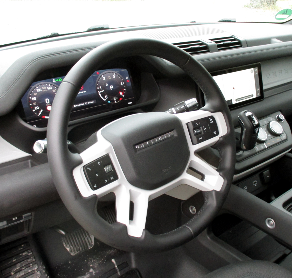 Das Fahren: Aluminiumchassis, extrem robust und verwindungssteif, sowie Einzelradaufhängung ersetzen Leiterrahmen und Starrachse. Das im Defender 110 standardmäßig verbaute Adaptivfahrwerk mit elektronisch geregelter Luftfederung sorgt für ordentlichen Komfort auch beim Fahren auf der Straße. Zu mehr Sicherheit tragen Wankneigungs-, Kurvenbremskontrolle und Anhängerstabilisierung bei. Über das Terrain-Response-System lässt sich der Wagen bis hin zu Gras, Schotter, Schnee, Schlamm, Sand und Felsen auf die unterschiedlichsten Untergründe einstellen. Schon die kurzen Überhänge vorn und hinten, dazu im Gelände 29,3 (statt normal 21,8) Zentimeter Bodenfreiheit, 38/40-Grad-Böschungs-, 28-Grad-Rampenwinkel und 90 Zentimeter Wattiefe wirken sich, unterstützt von An- und Abfahrhilfe am Berg, positiv im unwegsamen Terrain aus. Der Permanentallrad mit Untersetzung ist mit zweistufigem Verteilergetriebe und sperrbarem Mittendifferenzial kombiniert, kann optional mit aktivem Sperrdifferenzial hinten geordert werden. Die elektromechanische Servolenkung gibt ausreichend Rückmeldung. Die vorn und hinten innenbelüfteten Scheibenbremsen verzögern standfest.