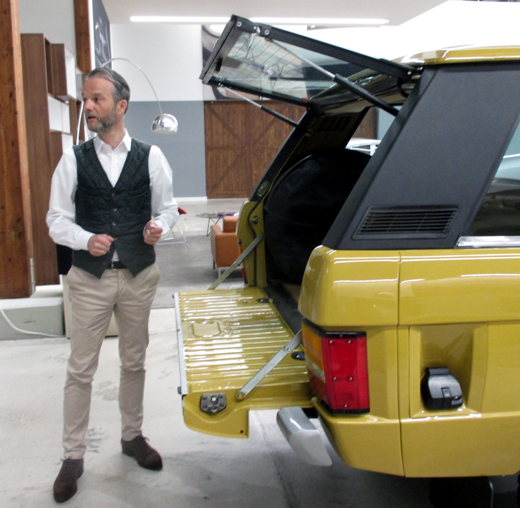 Mit dem Reborn-Programm, erklärt der Verkaufsleiter, hätten Sammler und Liebhaber die Möglichkeit, einen zweitürigen Range Rover zu besitzen, als ob er gerade von der Produktlinie damals gerollt sei. Jedes der Fahrzeuge, die aus der ganzen Welt stammen, wird demnach von der kleinsten Motorkomponente bis hin zur Wiederherstellung der ursprünglichen Farbgebung von Designern und Mechanikern in der modernen Aufbereitung gleich nebenan sorgfältig nach den Vorgaben aus der Entstehungszeit restauriert. Was natürlich auch seinen nicht gerade geringen Preis hat, der im Fall des bahama-goldenen Range Rovers am Ende der Beschreibung aber, warum auch immer, nur in Britischen Pfund aufgeführt ist, nämlich ab 145 000, umgerechnet ab161 500 Euro. „Es gelten die Garantiebedingungen.“