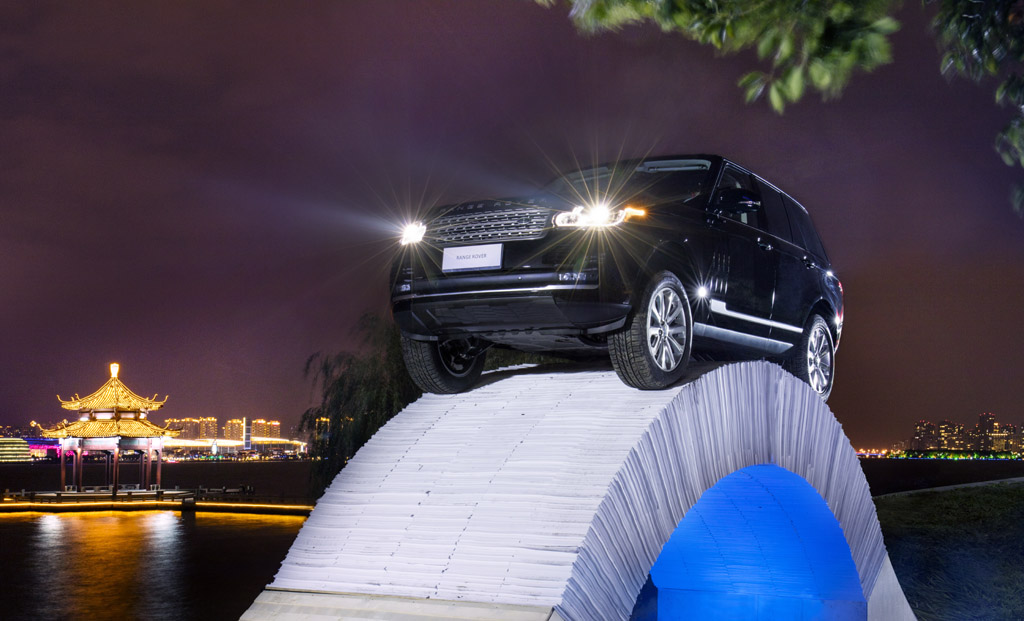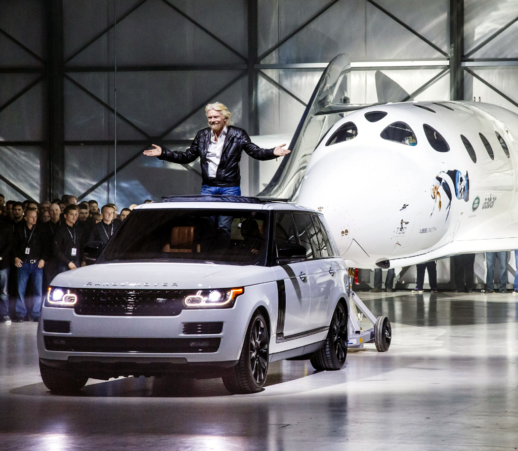 2015 geht es über eine Papierbrücke. 2016 zieht ein Range Rover einen Virgin-Galactic-Flieger in die Halle.