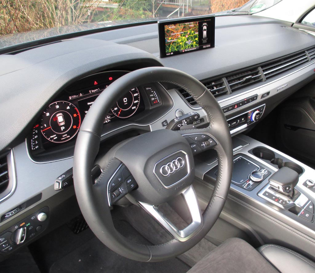 Der Turbodiesel schiebt diesen leer 2070 Kilo schweren Q7 beim Tritt aufs Gaspedal ziemlich heftig voran. Das mit Permanentallrad, dynamischer Antriebsverteilung und selbstsperrendem Mittendifferenzial kombinierte Fahrwerk wirkt diesmal insgesamt etwas komfortabler, hat trotzdem einen sehr agilen Eindruck hinterlassen. Die Charakteristik des Wagen ist noch komfortabler, dynamischer, effizienter, für All- und Offroadverhältnisse oder individuell einstellbar. Die elektromechanische Servolenkung gibt direkte Rückmeldung von der Straße. Die Scheibenbremsen packen standfest zu. Unter anderem Stabilitätskontrolle sowie Seitenairbags und Kopfairbags auch hinten tragen zum bereits sehr hohen Standard-Insassenschutz bei.