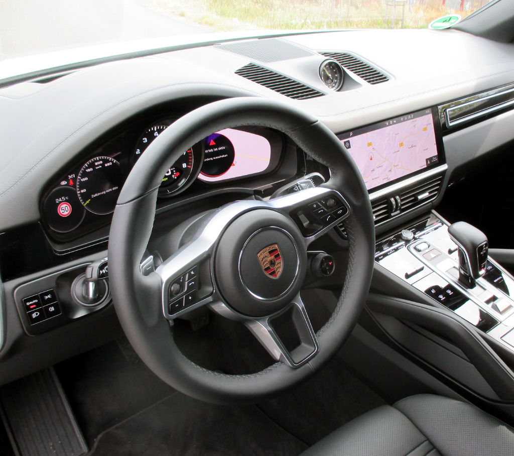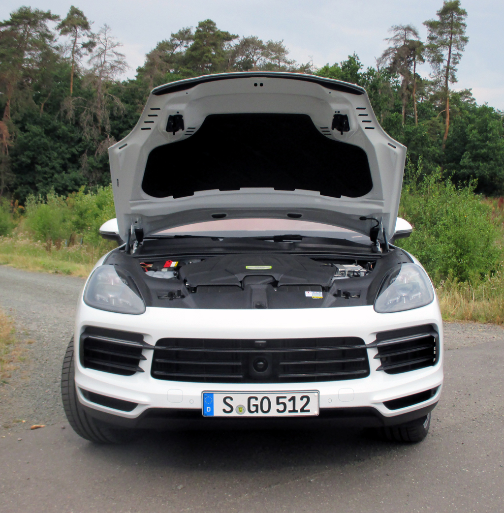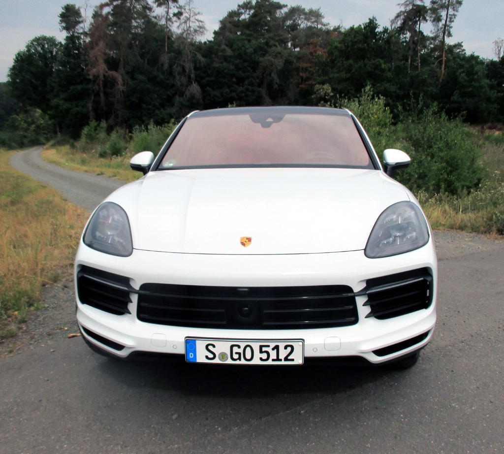 Bei dem getesteten Antrieb, freigegeben nach der strengeren Abgasnorm Euro-6d-Temp, handelt es sich um die Kombination aus einem Sechszylinder-Turbobenziner und einem Elektromotor. Der 3,0-Liter-Verbrenner leistet 340 PS, weist so schon ziemlich durchzugsstarke 450 Newtonmeter Drehmoment auf. Er und der Elektromotor mit 136 PS und 400 Newtonmetern bringen es im System gemeinsam auf 462 PS und 700 Newtonmeter. Damit beschleunigt der Coupé-Cayenne in 5,1 Sekunden aus dem Stand auf Tempo 100, ist in der Spitze 253, rein elektrisch 135 Stundenkilometer schnell. Eine sehr gut abgestufte, über entsprechende Paddel am Lenkrad auch handschaltbare Achtgang-Tiptronic-S-Automatik überträgt die Kraft auf alle vier Räder. Den in Verbindung damit nach dem realistischeren WLTP-Messverfahren zumindest im Datenblatt so aufgeführten kombinierten Sprit- und Stromverbrauch geben die Zuffenhausener mit 4,2 Litern und 23,7 Kilowattstunden an. Bei uns hat der Bordcompiter am Ende im Alltagsbetrieb nach normalen Orts-, Landstraßen- und eher moderaten Autobahnfahrprofilen 5,9 Liter und 25,2 Kilowattstunden angezeigt.