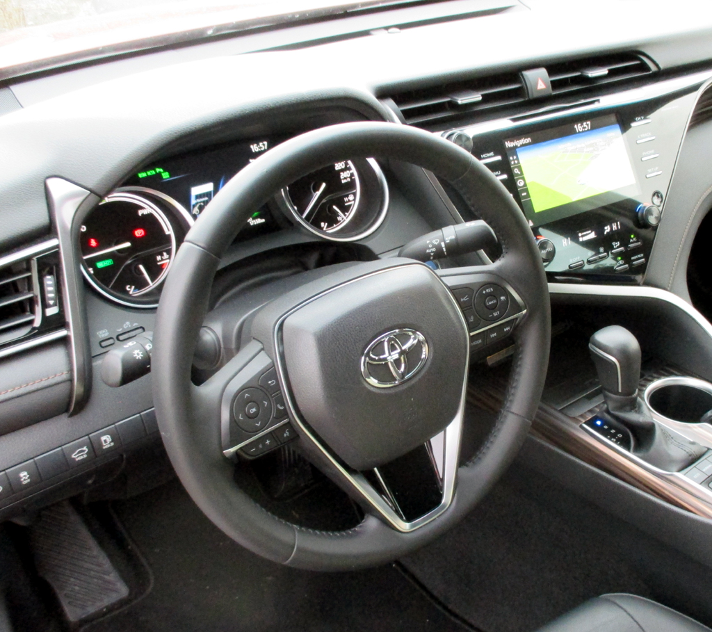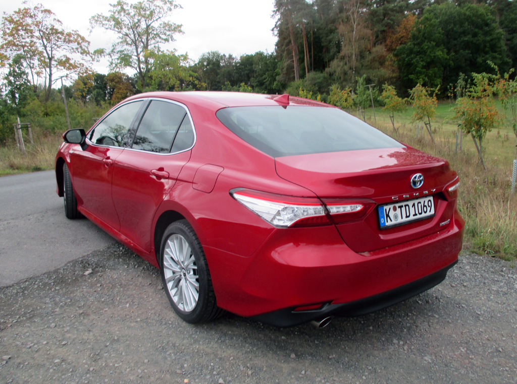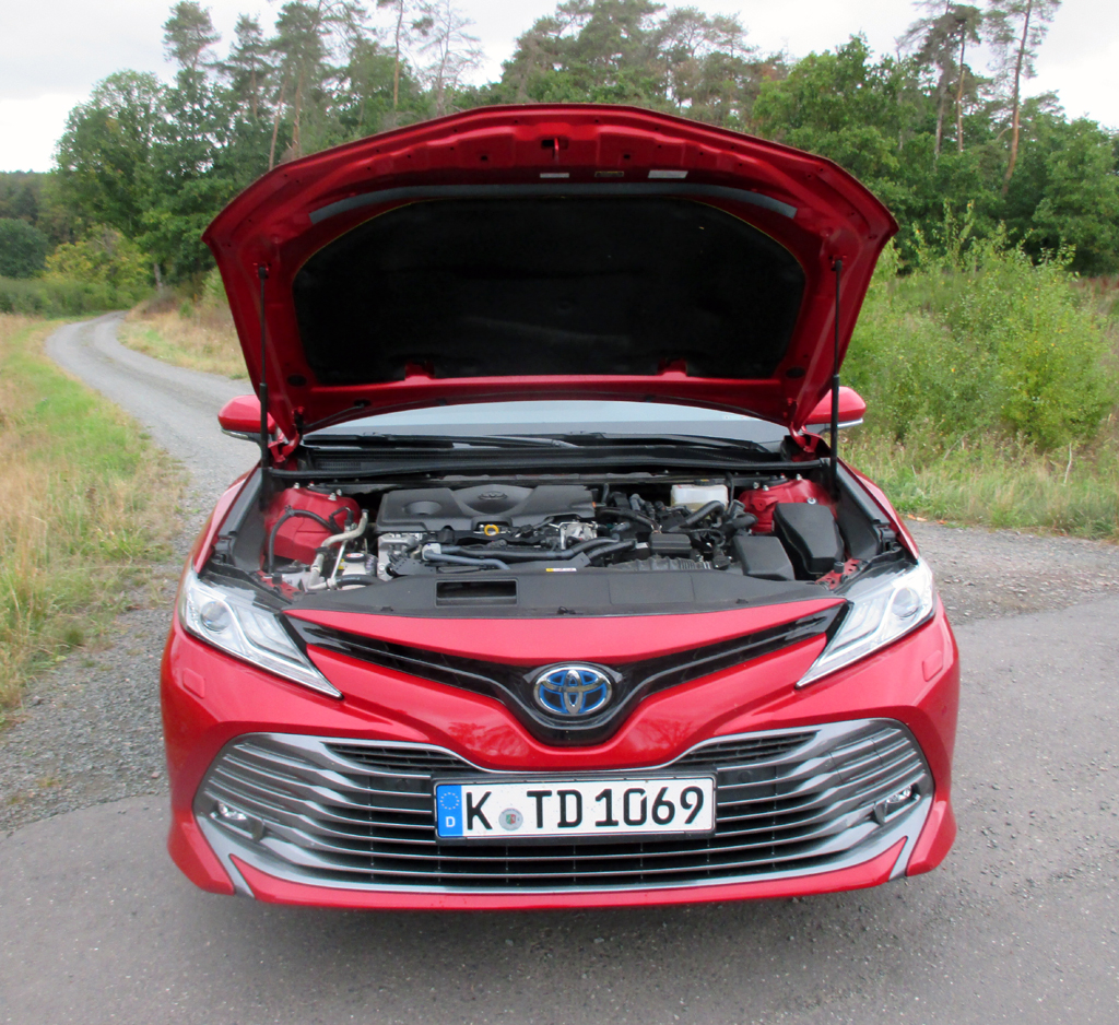 Längere Strecken sind mit dem Camry, der in Situationen wie beim beherzteren Überholen auch etwas lautstärker auf sich aufmerksam machen kann, dank seines Komforts kein Problem, selbst wenn die höchste Geschwindigkeit begrenzt ist. Weil die kleinere Batterie unter die hinteren Sitze passt, gibt sie nicht nur zusätzliches Stauvolumen im Kofferraum frei, ihre tiefere Anordnung senkt zugleich den Schwerpunkt des Wagens, was sich positiv im Verbund mit der steiferen Karosseriestruktur und dem im Handling verbessertem Fahrwerk samt Motor- und Radaufhängungen auch auf die Fahrdynamik auswirkt. Als Fahrprogramme sind Eco, Normal und Sport wählbar. Sie lassen sich sogar dann einsetzen, wenn sich das Auto im separat aktivierbaren Elektromodus befindet. Die elektrische Servolenkung könnte noch direktere Rückmeldung geben. Die Scheibenbremsen, vorn innenbelüftet, verzögern standfest. Unter anderem vorbeugende Kollisionswarnung, Fußgänger-, Verkehrsschilderkennung, Spurhaltehilfe tragen bereits zum Standard-Insassenschutz bei.