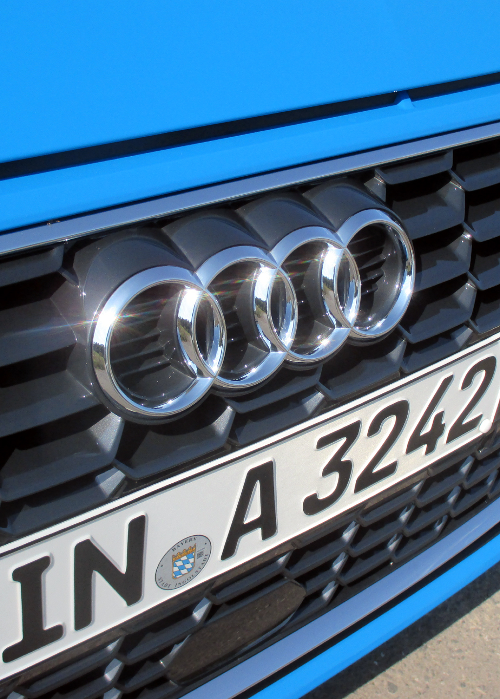 Blick auf die Frontpartie mit dem Markenlogo, den vier Ringen, oben im Kühlergrill.