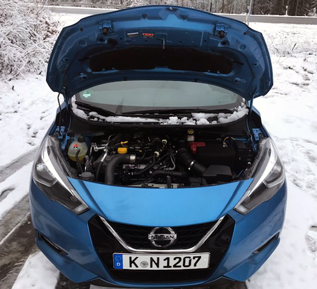 Bei dem mit einem stufenlosen Getriebe kombinierten 1,0-Liter-Dreizylinder-Turbobenziner handelte es sich noch um die Version mit 100 PS, die inzwischen von einer 92-PS-Variante abgelöst worden ist. Die stärkere Auflage verfügt über 144 Newtonmeter Drehmoment bei 2000 Touren beschleunigt in 13 Sekunden aus dem Stand auf Tempo 100. Der Vortrieb endet bei 177 Stundenkilometern. Das Triebwerk erfüllt die Abgasnorm Euro-6d-Temp. Die Xtronic-Automatik funktioniert vergleichsweise gut, sofern man keine sportlichen Ansprüche hat. Bei durchgetretenem Gaspedal heult der Dreizylinder zwar ganz schön auf, die erwartete Leistung bleibt aber aus. Am wohlsten scheint sich der hoch bis 5000 Touren drehende Motor bei mittleren Drehzahlen zu fühlen, legt bei dann eher moderater Lautstärke doch einiges Temperament an den Tag. Den Entwicklern ist es darüber hinaus inzwischen gelungen, den früher bei stufenlosen Automaten üblichen zähen Gummibandeffekt effektiv zu kompensieren. Die laut Nissan 4,7 Liter Mixverbrauch für den 100-PS-Micra haben wir nach zweiwöchigem Standardtest mit normalen Orts-, Landstraßen- und zügigeren Autobahnfahrprofilen nicht erreicht. Bei uns hat der Borcomputer am Ende sogar überraschend hohe 8,6 Liter angezeigt.