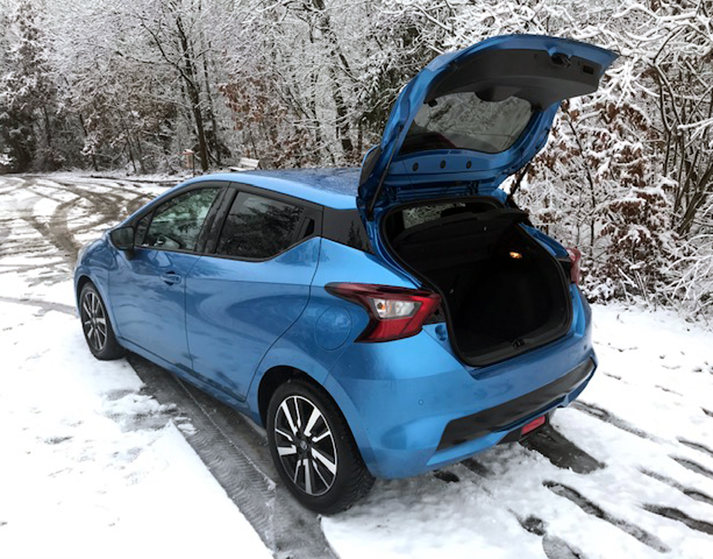 Der 3,99 Meter lange, 1,74 Meter breite und 1,45 Meter hohe Fünftürer gefällt durch seine leichte Keilform, die dem leer bis zu 1200 Kilo schweren Fünfsitzer ein recht sportliches Äußeres verleiht. 2,52 Meter Radstand sorgen für ordentlich Platz. Der 300 bis 1004 Liter große Kofferraum ist variabel nutzbar. Der Micra wirkt alles in allem solide verarbeitet, bietet gutes Raumgefühl, mutet für sein Segment zumindest in N-Way-Ausführung für einen Wagen dieser Größenordnung sogar relativ wertig an. Hinten geht es natürlich etwas beengter zu. Die Rücksitze sind geteilt umklappbar, bilden dann aber doch eine schräg angestellte Auflagefläche, die zudem auch noch durch eine unpraktische Stufe unterbrochen wird. Die Ladekante liegt ziemlich hoch. Das klar gegliederte Cockpit wartet mit ganz angenehmer Haptik und durchaus intuitiver Bedienbarkeit auf. Lediglich die schmalen Fenster schränken die Sicht nach hinten etwas ein.