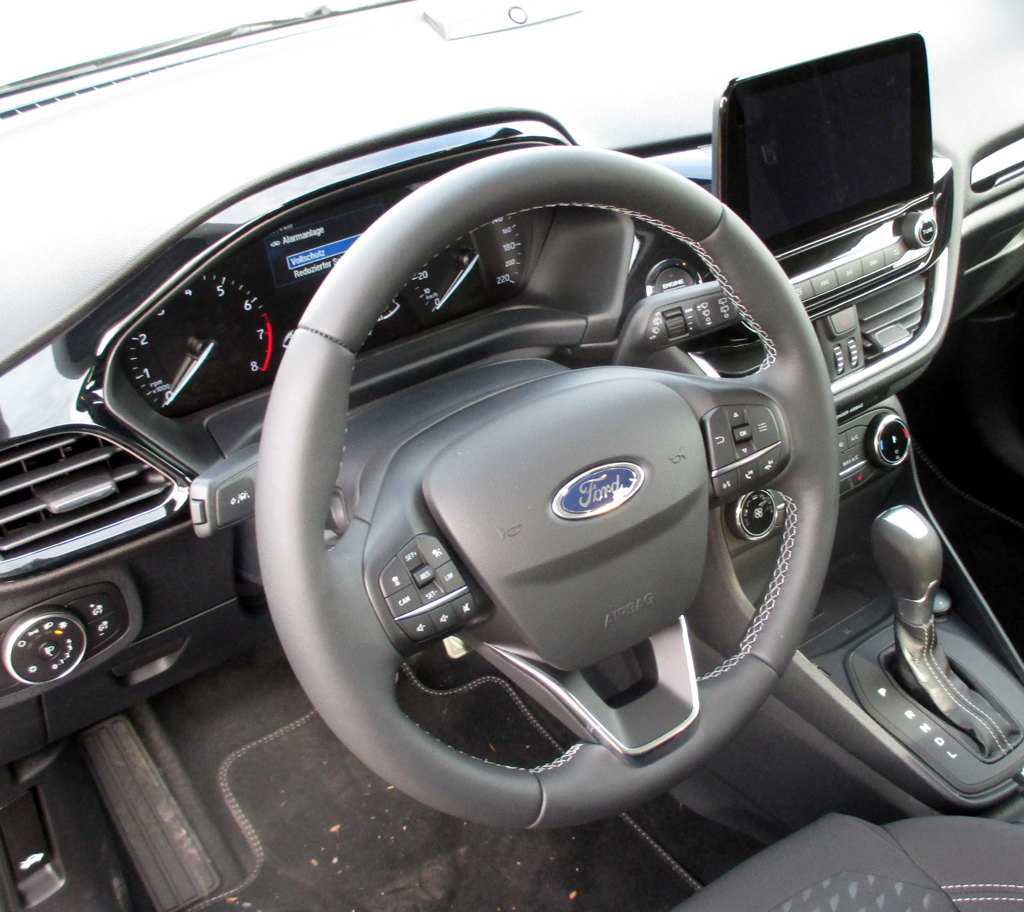 Beim Motor handelt es sich um einen EcoBoost-Dreizylinder. Blick ins moderne Cockpit.