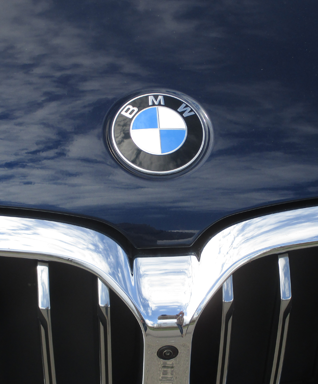 Blick auf die Frontpartie mit dem Markenlogo vorn über dem Doppelnieren-Kühlergrill.