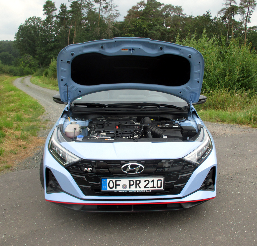 Vierzylinder-Turbobenziner. Abgasnorm Euro-6d. 1,6 Liter Hubraum. 204 PS. Maximal 275 Newtonmeter Drehmoment bei 1750 bis 4500 Umdrehungen pro Minute. Mittels Overboost kurzzeitig 304 Newtonmeter bei 2000 bis 4000 Touren. In 6,2 Sekunden aus dem Stand auf Tempo 100. 230 Stundenkilometer Spitze. Frontantrieb. Sechsgang-Schaltgetriebe. Laut Hyundai nach WLTP 7,0 Liter Mixverbrauch. Testverbrauch am Ende des zweiwöchigen Standardtests mit normalen Orts-, Landstraßen- und schnellen Autobahnprofilen bei unterschiedlichen Fahrmodi 7,8 Liter.