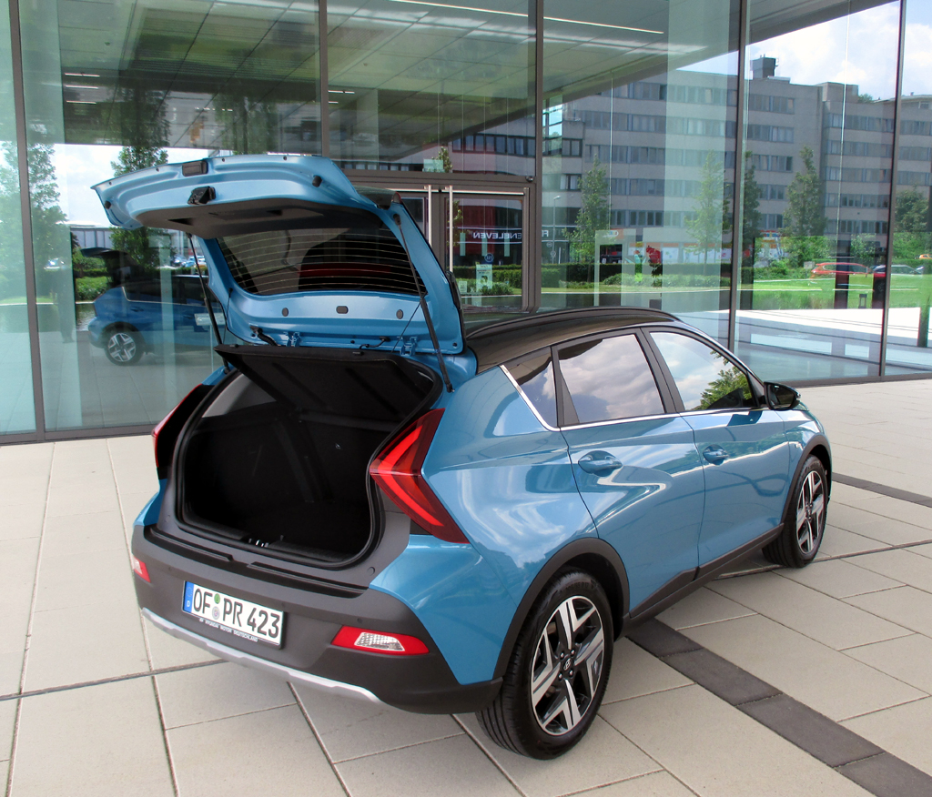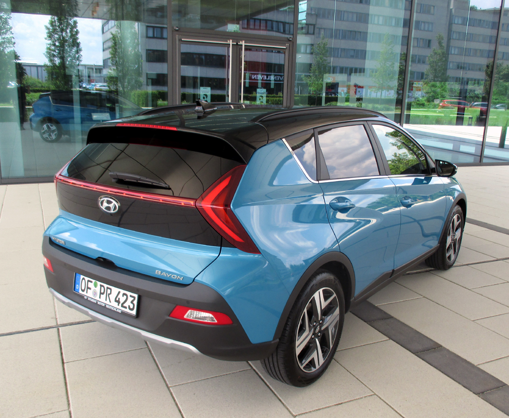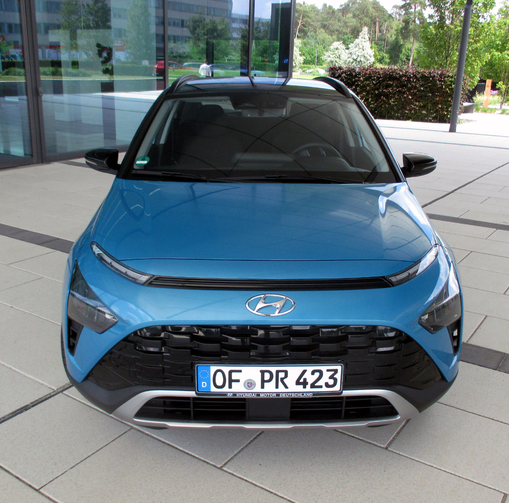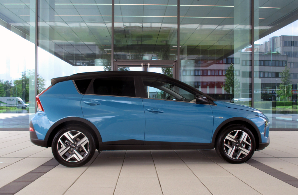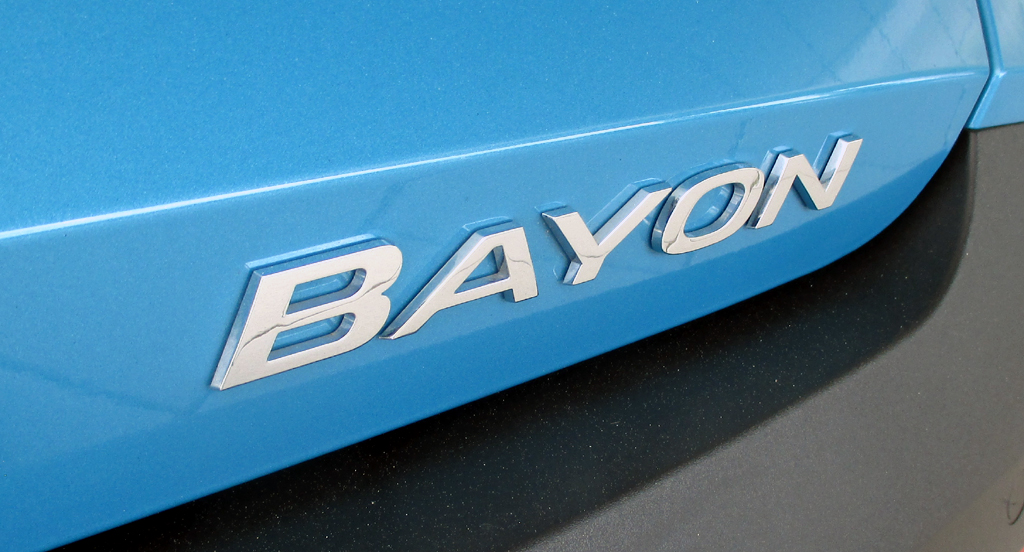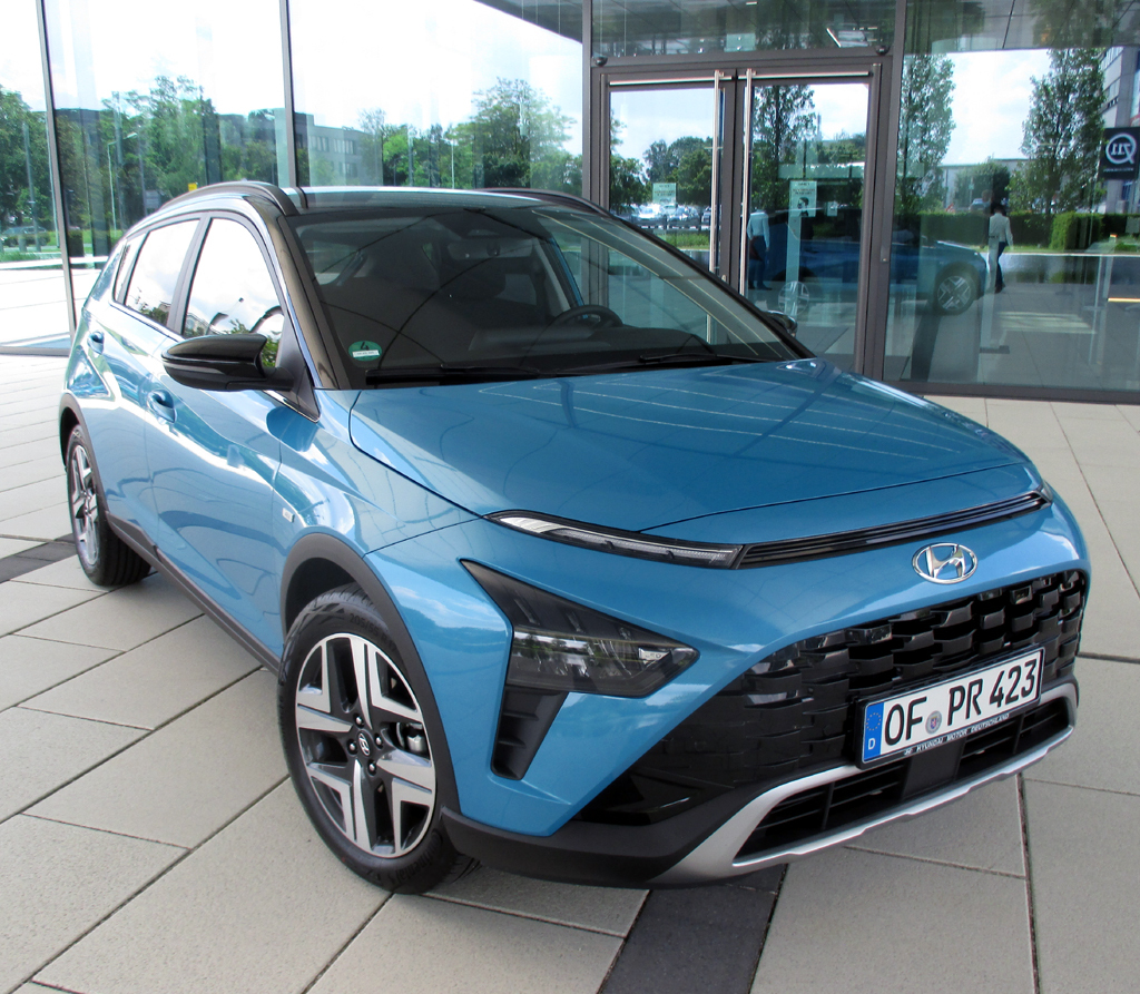 Formschöner fünftüriger Fünfsitzer. Nimmt robusteren Lifestyle-Charakter des nicht mehr im Programm befindlichen i20 Active in eigener Baureihe auf. Teilt sich Technik mit preisgünstigerem i10. Nach Bayonne im südwestfranzösischen Département Pyrénées-Atlantiques benannt. Seit 2021 auf dem Markt. Solide verarbeitet. Für Kleinwagensegment recht wertig anmutend. Noch unterhalb vom Kona positioniert. 4,18 Meter lang. 1,77/2,04 Meter breit. 1,49/1,50 Meter hoch. Radstand 2,58 Meter. Kofferraum 411/334 bis 1205/1128 Liter. Steile Front mit schmalen Tagfahrlichtern und hohen Schultern. Man sitzt höher. Ordentlich Platz. Alles liegt ganz gut im Blick. Modernes Cockpit-Layout. Leicht bedienbar.