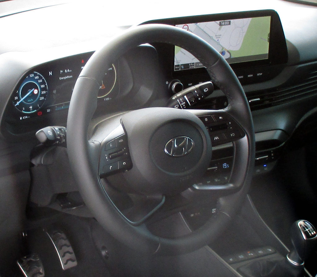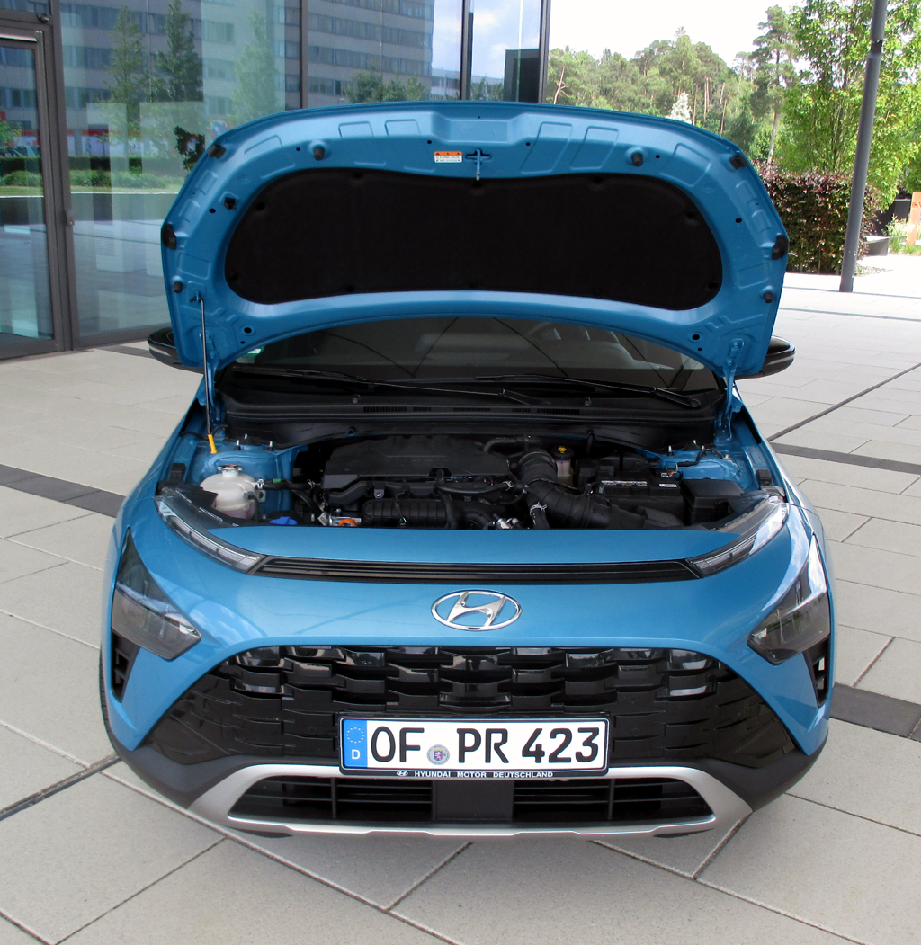 Dreizylinder Turbobenziner. Abgasnorm Euro-6d. 1,0 Liter Hubraum. Maximal 172 Newtonmeter Drehmoment ab 1500 bis 4000 Umdrehungen pro Minute. 48-Volt-Mildhybrid-Technik. Startergenerator über Riemen mit Kurbelwelle verbunden. Strom wird in Lithium-Ionen-Polymer-Akku unter Gepäckraumboden gespeichert. Der sogenannte Inverter ist für Wechsel zwischen Antriebs- und Lademodus da. In 10,4 Sekunden aus dem Stand auf Tempo 100. 185 Stundenkilometer Spitze. Sechsgang-Schaltgetriebe. Frontantrieb. Laut Hyundai kombiniert 5,5 Liter Verbrauch nach WLTP. Testverbrauch nach zweiwöchigem Standardtest mit normalen Orts-, Landstraßen- und zügigeren Autobahnfahrprofilen bei dennoch eher moderater und möglichst konstanter Fahrweise ohne größere Lastwechsel am Ende laut Bordcomputer 6,7 Liter.