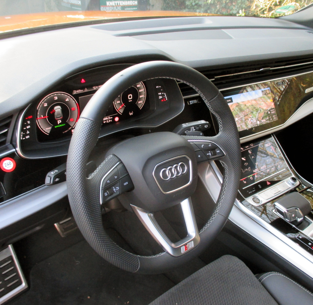 Die Technik stammt vom Q7. Der Auftritt wirkt dynamischer. Trotz 2235 Kilo Leergewicht stellt sich antriebsmäßig neben Präzision durchaus auch Leichtfüßigkeit ein. Der Allrad ist Serie. Wer will, kann einen luftgefederten Unterbau ordern. Die feinfühlige Allradlenkung trägt ihren Teil zur Agilität des SUV-Coupés bei. Selbst beim schärferen Anbremsen vor der Kurve knickt dieser Audi kaum ein. Geht man die Biegungen jedoch etwas zu flott an, kommt man auch beim Q8, der Lasten bis 2,8, in Verbindung mit adaptiver Luftfederung sogar bis 3,5 Tonnen ziehen kann, bald in den physikalischen Grenzbereich. Neben der optionalen Allradlenkung hat im Testwagen etwa auch das Assistenzpaket Plus mit einer ganzen Reihe von elektronischen Hilfen das Insassenschutz-Niveau weiter erhöht.