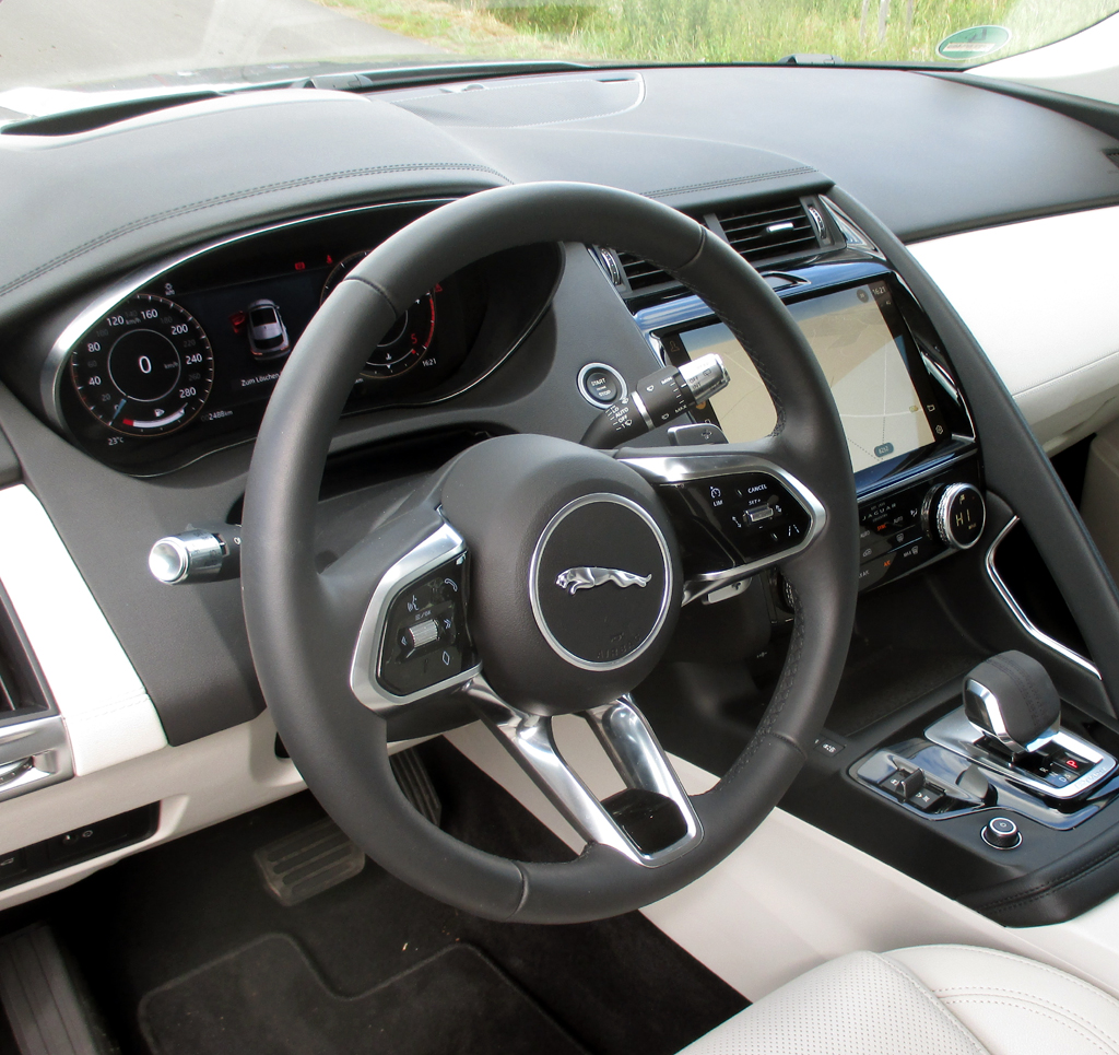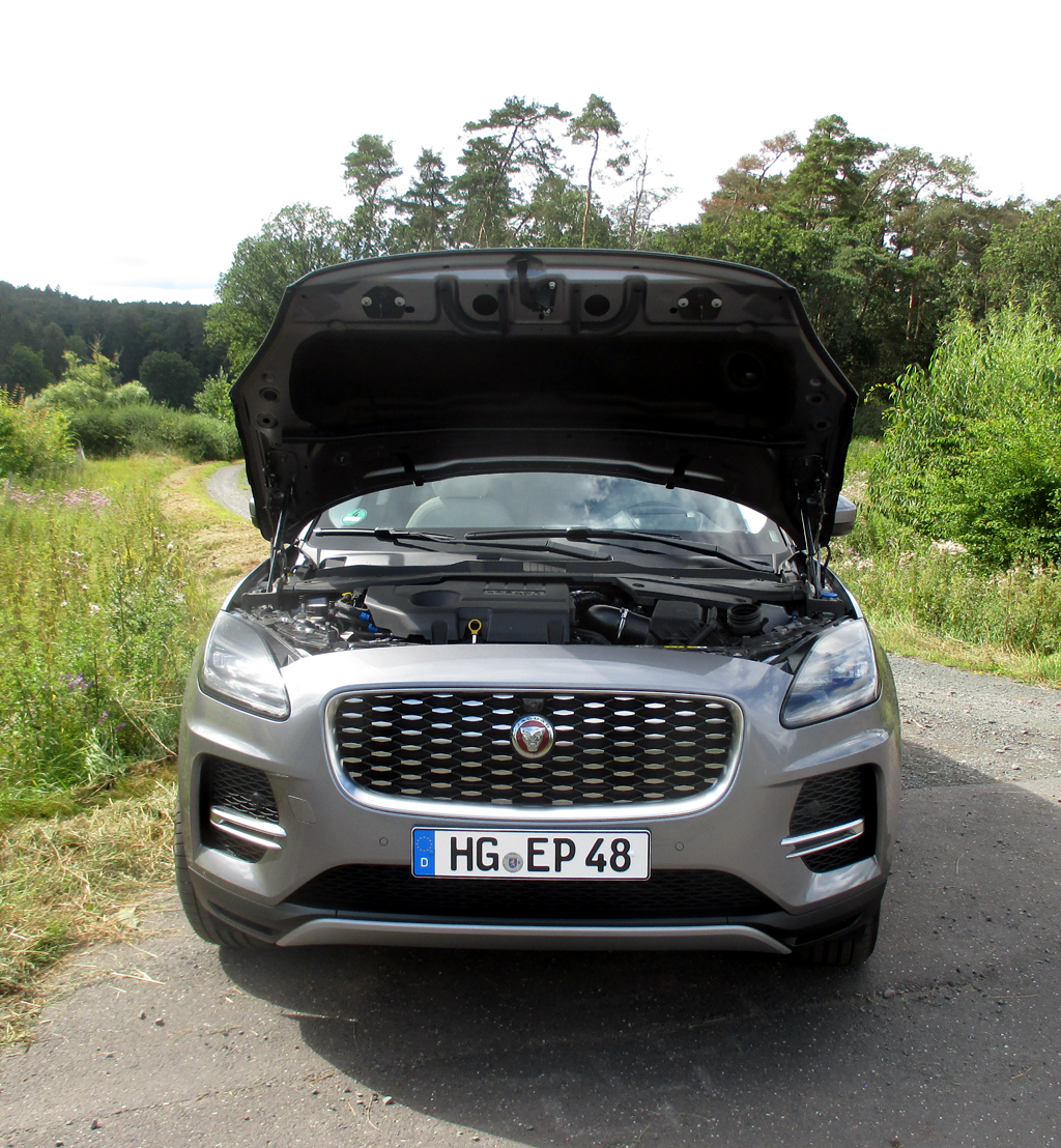 Der Turbodiesel läuft kultiviert, schiebt den leer 1952 Kilo schweren E-Pace beim Tritt aufs Gaspedal druckvoll voran, kann Lasten bis 1800 Kilo ziehen. Sein Drehmomentmaximum steht schon ziemlich früh bereit. Die Automatik wechselt sanft, zügig und präzise die neun Stufen. Als Mildhybrid speichert dieser Jaguar beim Bremsen oder Ausrollen die Energie in der 48-Volt-Batterie, um sie später etwa beim zügigeren Beschleunigen zu nutzen. Die Start/Stopp-Funktion spricht komfortabler und schneller an. Das Fahrwerk hat einen genauso komfortabel federnden wie sportlichen Gesamteindruck hinterlassen. Der Allrad mit elektronisch gesteuerter Momentenverteilung zwischen vorn und hinten erhöht mit der Traktion die Stabilität beim Fahren, trägt zu besserer Geländegängigkeit bei. Die elektromechanische Servolenkung gibt direkte Rückmeldung. Die Scheibenbremsen packen standfest zu. Tempomat samt Begrenzer, Rückfahrkamera, Aufmerksamkeits-, Brems-, Spurhalteassistenz tragen bereits im günstigsten E-Pace zum Standard-Insassenschutz bei.
