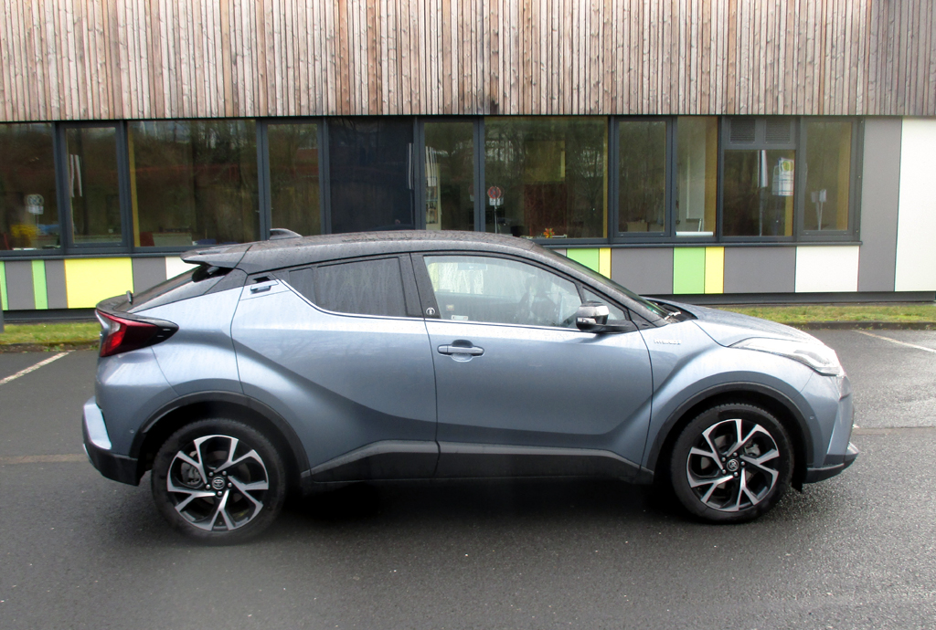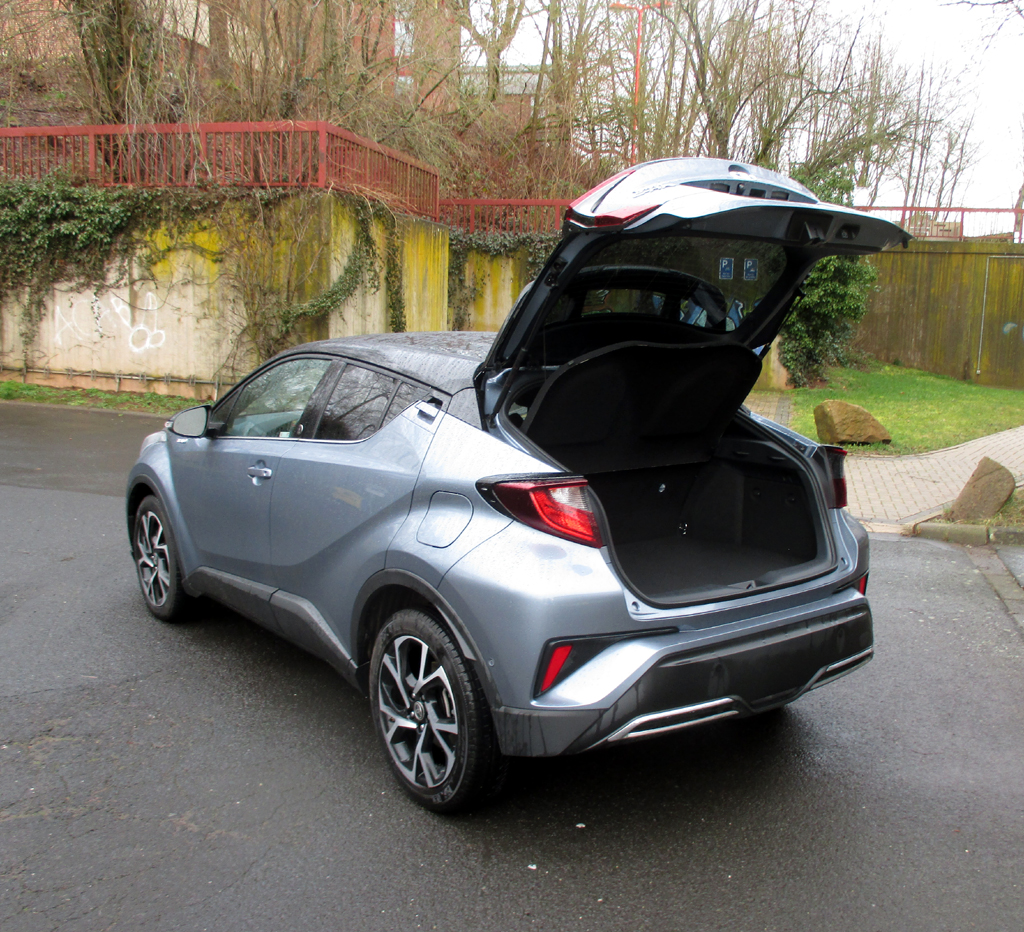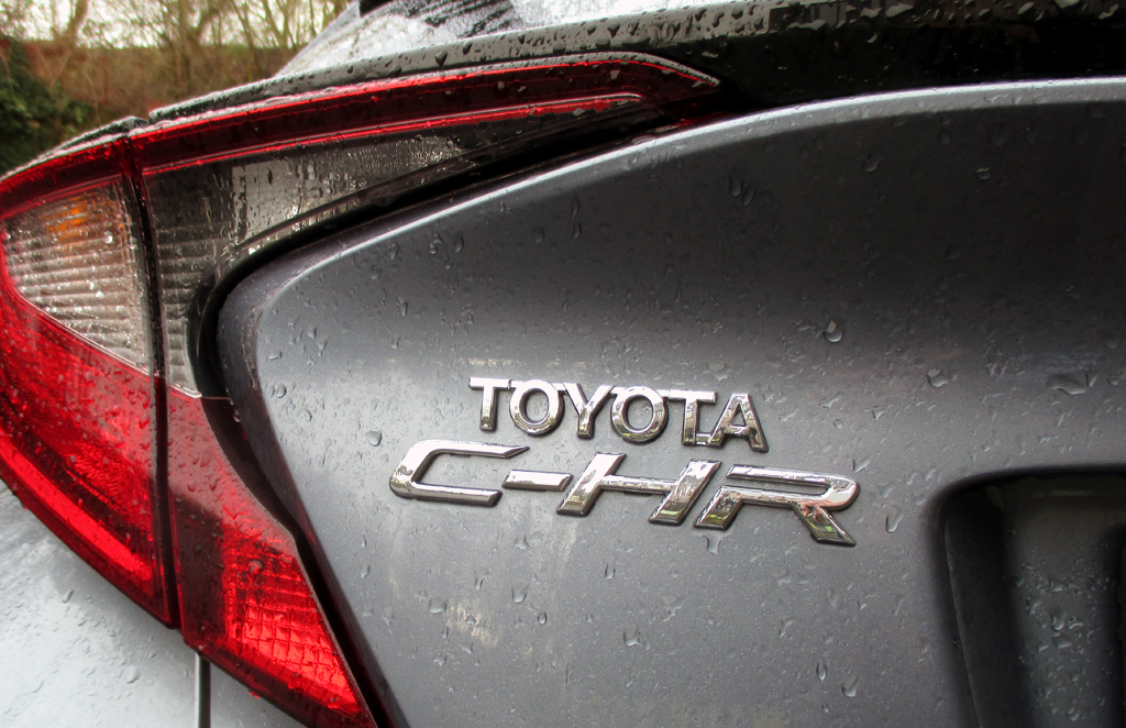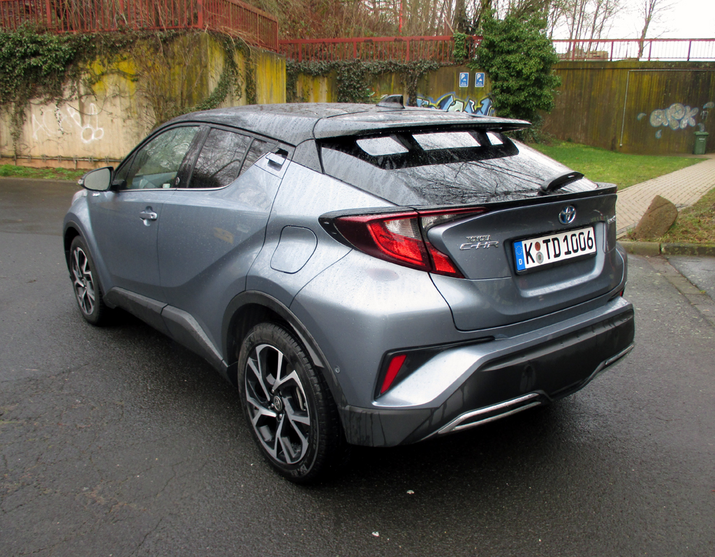 Heck-/Seitenansicht des optisch nicht mehr ganz so polarisierenden C-HR mit Modellschriftzug hinten.