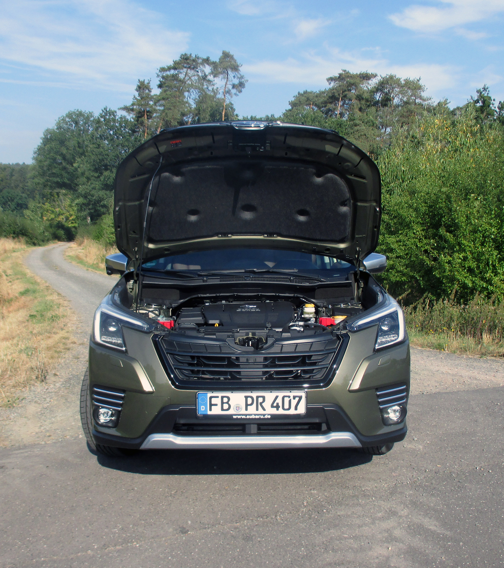 Vierzylinder-Boxerbenziner plus Elektromotor. Abgasnorm Euro-6d. 2,0 Liter Hubraum. Leistung Verbrenner 110/150, Leistung Elektromotor 12,3/16,7 kW/PS. Maximal 194 Newtonmeter Drehmoment ab 4000 Touren pro Minute. In 11,8 Sekunden aus dem Stand auf Tempo 100. 188 Stundenkilometer Spitze. Permanentallrad. Stufenlose, auch handschaltbare Lineartronic-Automatik. Testverbrauch laut Bordcomputer 7,8 Liter pro 100 Kilometer, nach WLTP 154 Gramm Kohlendioxidausstoß pro Kilometer bei angegebenen 6,7 Litern Mixverbrauch. Der Forester in dieser Form bringt leer 1693 Kilo auf die Waage.*