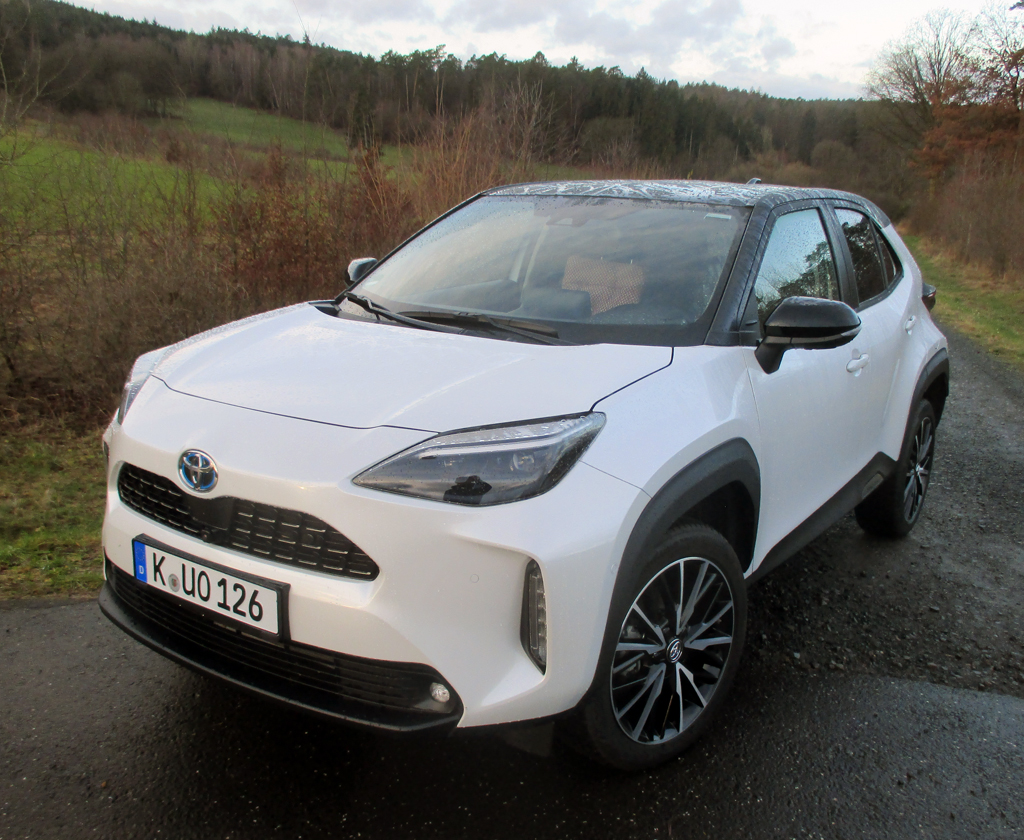 Den Yaris Cross hat Toyota noch unterhalb vom C-HR positioniert. Wir haben das kompakte Crossover-SUV-Modell der Japaner jetzt als frontangetriebenen Hybrid mit Automatik in Elegant-Ausführung gefahren. Auto: Fünftüriger Fünfsitzer. Segment: Kleinwagen. Produktion: Frankreich. Eingeführt: 2021. Konkurrent: Hyundai Kona Hybrid. Länge: 4,18 Meter. Breite: 1,76 Meter. Höhe: 1,59 Meter. Radstand: 2,56 Meter. Leergewicht: 1170 bis 1360 Kilo. Design: Wuchtiger wirkender, robusterer Abenteuer-Look mit dunklen Kunststoff-Beplankungen an Radläufen und Schwellern, etwas höherer Bodenfreiheit und Unterfahrschutz vorn und hinten. Verarbeitung: Ordentlich. Anmutung: Für die Yaris-Klasse standesgemäß. Innenraum: Vorn noch ganz gut Platz. Hinten, was Bein- und Kopffreiheit betrifft, etwas beengter. Rundumsicht könnte besser sein. Einfache Materialauswahl. Gepäckabteil: 397 bis 1097 Liter. Cockpit: Digital. Übersichtlich. Bedienung: Schnell im Griff. Antrieb*: 116-PS-Hybridsystem aus dem Yaris bekannt. Dreizylinder-Saugbenziner mit Elektromotor und leistungsverzweigter stufenloser Automatik kombiniert. Fahren: Dank Doppelherz-Kraft etwas druckvoller. Beim flotteren Unterwegssein jedoch andauernd höhere Motordrehzahlen und so leider auch lautere Geräuschkulisse. Geringe Anhängelast. Fahrwerk: Lobenswerter Antriebskomfort, wenn man es entspannter angehen lässt. Sichere Fahreigenschaften, die unterm Strich allerdings doch auch etwas dynamischer ausfallen könnten. Lenkung: Elektrisch. Könnte direktere Rückmeldung geben. Bremsen: Verzögern standfest. Sicherheit: Unter anderem Rückfahrkamera, Aufmerksamkeits-, Spurverfolgungsassistenz, Totwinkelwarner, Adaptivtempomat, Geschwindigkeitsbegrenzer, Verkehrszeichenerkennung. Ausstattung: Umfangreich, schon was das Serienpaket und den Komfort angeht. Fünf Ausstattungslinien mit Elegant als zweithöchster davon etwa mit LED-Matrix-Scheinwerfern, Klimaautomatik, Acht-Zoll-Multimediadisplay, Navigation, Digitalradio, Teilleder, beheizbarem Lederlenkrad, elektrischer Heckklappe und 18-Zoll-Leichtmetallrädern mit 215er-Reifen. Extras: Nur wenige. Es sind dies Vision-Paket mit farbigem Zehn-Zoll-Headup-Display und mit Panorama-Glasdach (790 Euro), Anhängezugvorrichtung (890 Euro) und Bi-Tone-Lackfarben (1000/1240 Euro). Baureihe: Der Yaris Cross fängt preislich bei 25 340 Euro an. Allradversion ist ab 35 120 Euro zu haben. Fazit: Auch wenn er gut ausgestattet ist: Deutlich über 30 000 Euro Anschaffungskosten sind viel Geld für einen Kleinwagen, der in diesem Fall mit seinem eher lifestyligeren Charakter punkten kann. Der normale Yaris ist ab 25 500 Euro zu haben, der sportliche GR ab 34 000 Euro.