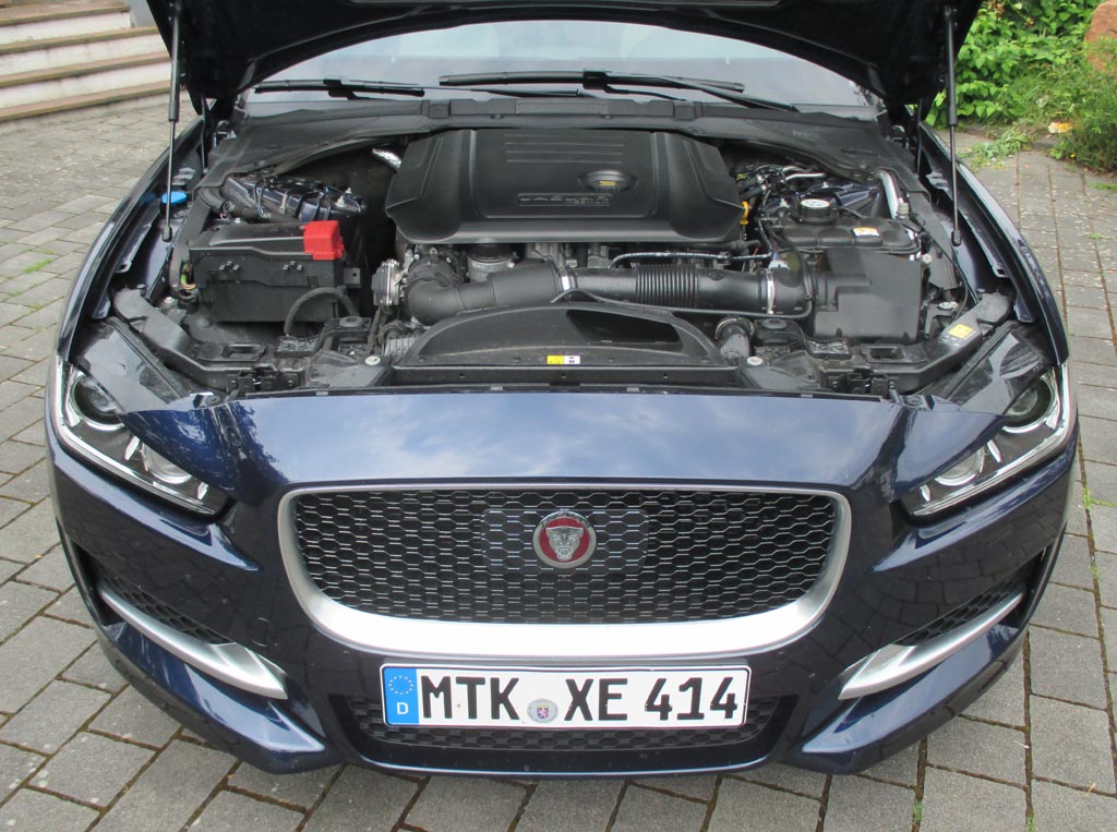 Der Turbodiesel schiebt diesen leer 1615 Kilo schweren XE ziemlich flott voran. Der Allrad ist stufenlos variabel. Die Kraft wird normal komplett auf die Hinterachse geleitet. Im Extremfall ist eine 50:50-Verteilung möglich. Es gibt einen eigenen Wintermodus. Das im R-Sport serienmäßige verbaute Sportfahrwerk übertreibt es in der Grundauslegung nicht mit der Härte. Die Elektronik sorgt dafür, dass der XE auch bei schlechten Witterungsbedingungen ausreichend Traktion erhält. Die elektromechanische Servolenkung gibt direkte Rückmeldung. Die Scheibenbremsen verzögern standfest. Unter anderem dynamische Stabilitätskontrolle, Seitenairbags und durchgehende Fensterairbags tragen bereits zum Standard-Insassenschutz bei.