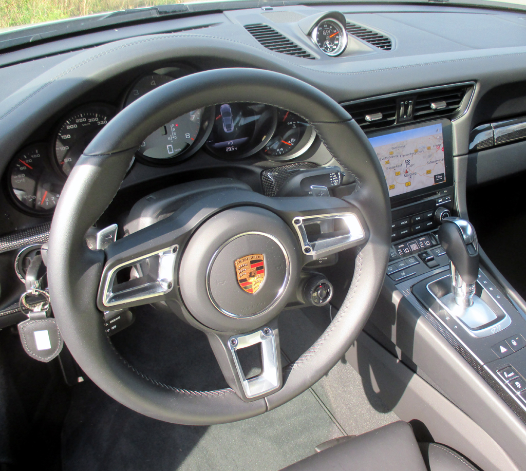 Das Gepäckabteil vorn fasst immerhin nich 145 Liter. Im Cockpit des 911 geht es gewohnt sportlich zu.