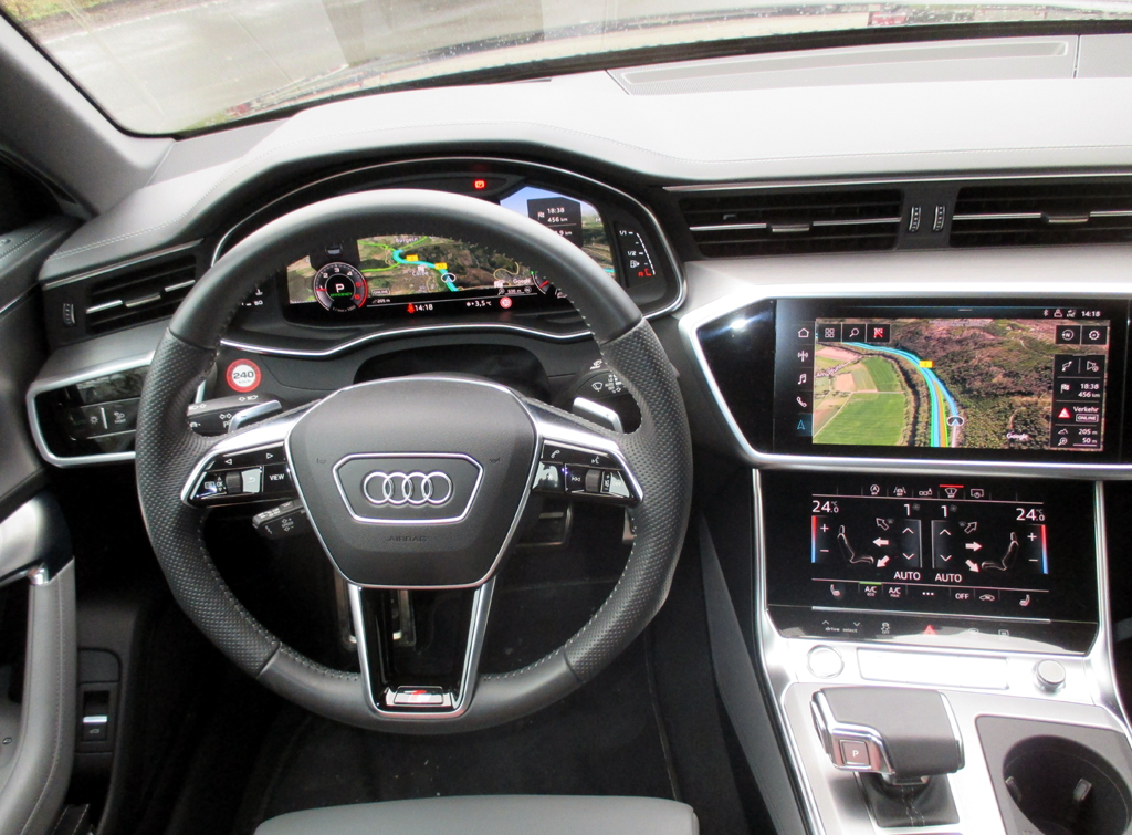 Die neue Generation, gewohnt sauber verarbeitet, wertig anmutend, schlanker wirkend, 4,93 Meter lang, 2,92 Meter Radstand, Kofferraum 530 Liter, ist seit 2018 bei uns auf dem Markt. Die breiten Schultern, die größeren Räder, die ausgestellten Kotflügel betonen schon äußerlich den Quattro-Antrieb. Im geräumigen Inneren – hinten steht mehr Beinfreiheit zur Verfügung – geht es wie immer weitgehend edel zu. Drei Bildschirme beherrschen mittlerweile das Cockpit, darunter die beiden Touchscreen-Monitore mit akustischem und haptischem Feedback in der Mittelkonsole, der untere fürs Klima und die Schrifterkennung, der obere für fast alle anderen der ähnlich wie im größeren A8 meist digital gesteuerten Funktionen. Um alles tatsächlich nutzen zu können, sollte man sich etwas Zeit nehmen für die Eingewöhnung in die Bedienung.
