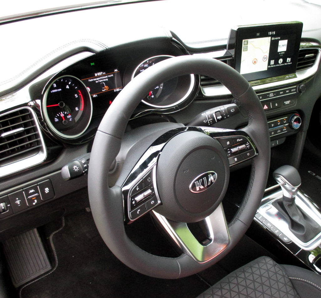 Bei dem getesteten Vierzylinder handelt es sich um einen relativ laufruhigen 1,6-Liter mit 136 PS und durchzugsstärkeren 320 Newtonmetern ab 2000 Touren. Der nach der strengeren Abgasnorm Euro-6d-Temp freigegebene Selbstzünder macht diesen Kia in der Spitze bis zu 200 Stundenkilometer schnell. Ein gut abgestuftes Siebengang-Doppelkupplungsgetriebe überträgt die Kraft auf die vorderen Räder. Die zumindest im Datenblatt in Verbindung mit der spritsparenden Stopp/Start-Funktion so angegebenen knapp über vier Liter Mixverbrauch haben wir nicht erreicht. Bei uns hat der Bordcomputer im Alltagsbetrieb am Ende nach normalen Orts-, eher moderaten Landstraßen- und zum Schluss zügigeren Autobahnfahrprofilen 5,6 Liter angezeigt.