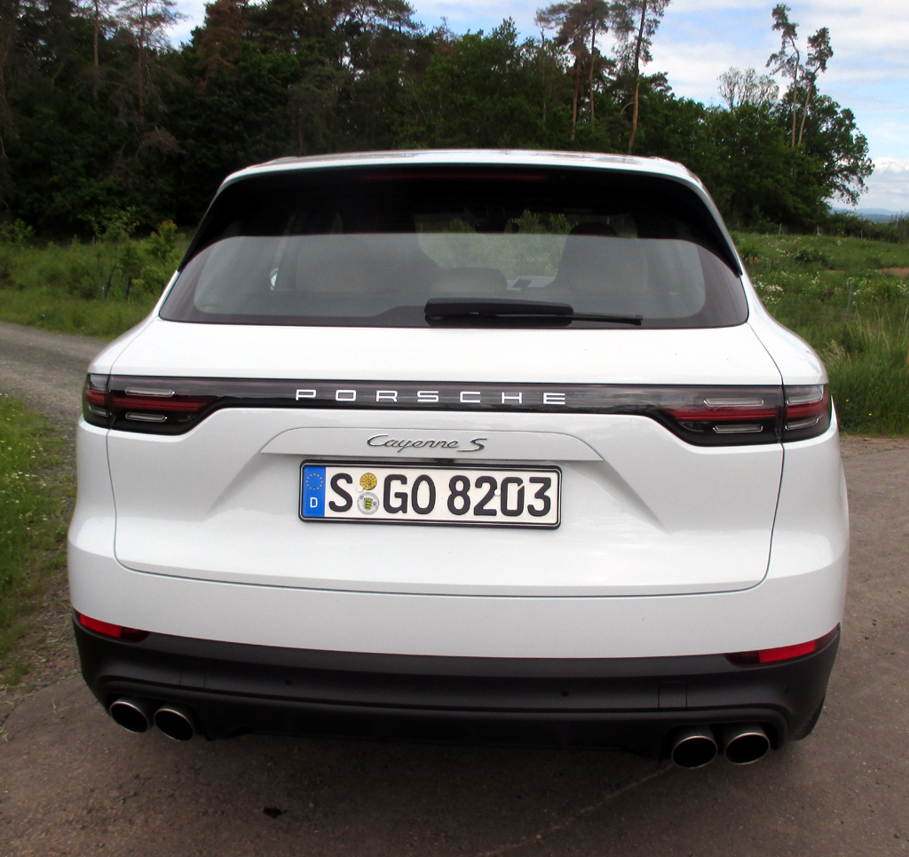 Der drehfreudige Doppelturbo schiebt den leer je nach Norm doch bis zu 2095 Kilo schweren Aktivallradler, der Lasten bis 3,4 Tonnen ziehen kann, vehement voran. Selbst im Sportmodus federt das Fahrwerk, gut für längere Strecken, noch durchaus komfortabel. Im Normalmodus könnte der Wagen bisweilen etwas spritziger sein. Der Individualmodus erlaubt weiteres Nachschärfen. Die Lenkung gibt präzise Rückmeldung. Die Bremsen, vorn und hinten innenbelüftete Scheiben, packen standfest zu. Insbesondere mit Blick auf Größe und Gewicht legt der Cayenne S ein hervorragendes Handling an den Tag, unterstützt in diesem Fall sogar noch von der optionalen Adaptivluftfederung mit Niveauregulierung und Höhenverstellung sowie der ebenfalls optionalen Hinterachslenkung. Integrierte Fahrwerksregelung, Multikollisionsbremse, Bergabfahrhilfe, Tempomat samt Begrenzer sowie als Sonderausstattung im Test-Cayenne zusätzlich Spurwechselhilfe und Abstandsregler inklusive Nothaltefunktion tragen zum Standard-Insassenschutz bei.