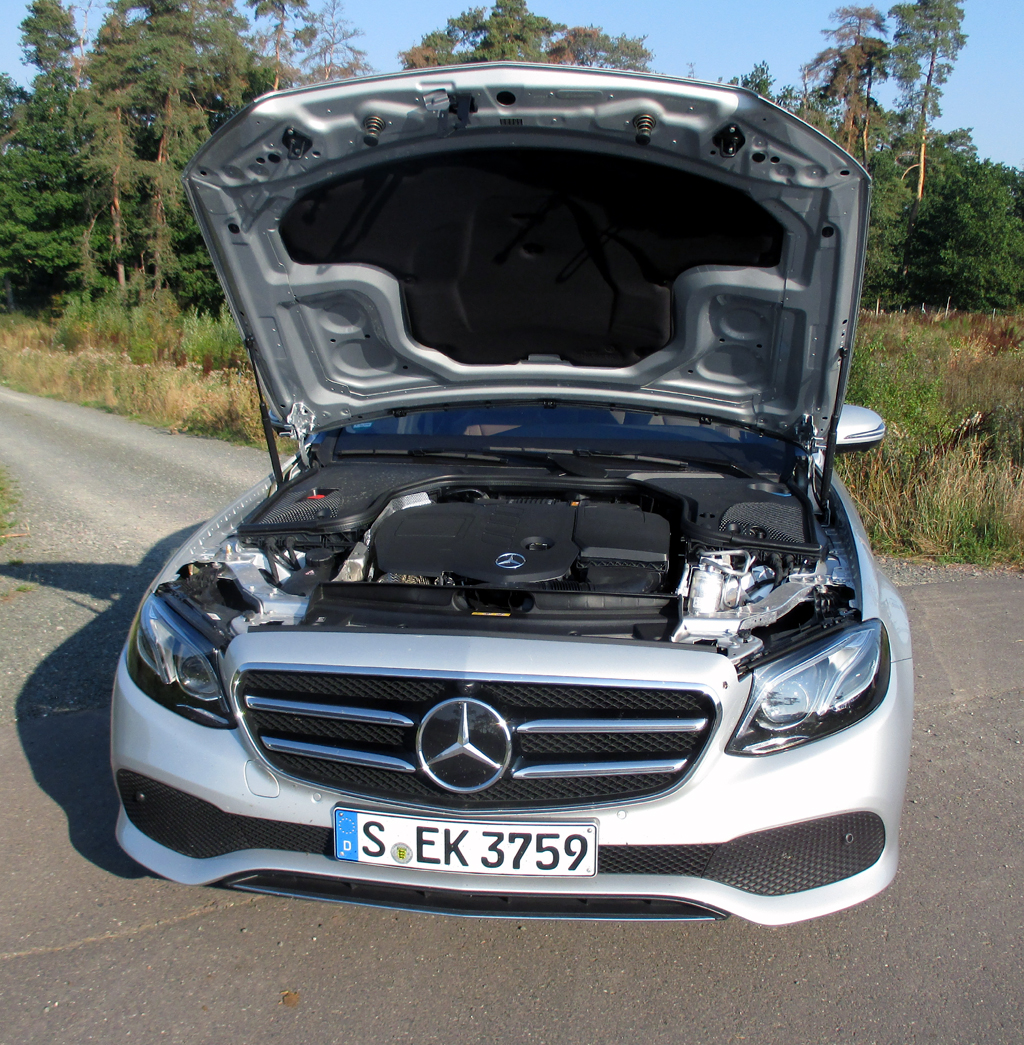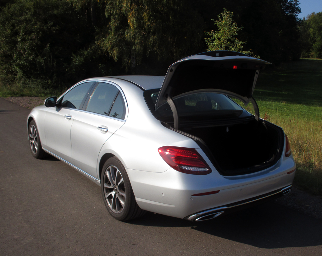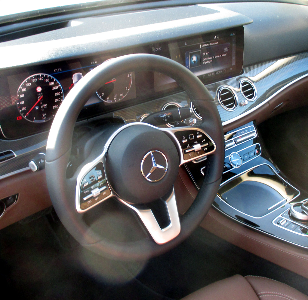 Außen & Innen: Die seit 1993 fünfte Generation unter der Bezeichnung E-Klasse steht seit 2016 bei den Händlern, kommt auf 4,92 Metern Länge sauber verarbeitet daher, mutet ziemlich wertig an. Bei 2,93 Metern Radstand ist selbst im Fond des viertürigen Stufenhecks noch ordentlich Platz vorhanden. Das Gepäckabteil fasst stattliche 540 Liter. Hinterlässt die E-Klasse äußerlich vom Design her wohl auch mit Blick auf die Kundschaft einen nach wie vor eher zurückhaltenden Eindruck, präsentiert sich ihr Cockpit dank der durchgehenden beiden Großdisplays sehr übersichtlich und modern, wobei man sich für die Eingewöhnung in das onlinefähige Multimediasystem in jedem Fall Zeit nehmen sollte, um es sinnvoll nutzen zu können. Die Rundumsicht könnte insgesamt noch etwas besser sein.