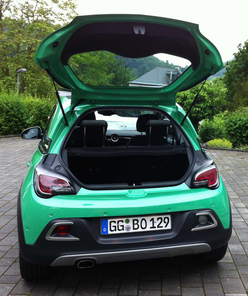 Als Rocks ist der Adam seit 2014 auf dem Markt, kommt auf 3,74 Metern Länge solide verarbeitet daher, mutet für sein Segment ziemlich wertig an. Platz ist bei 2,31 Metern Radstand vorn noch ganz ordentlich vorhanden. Im Fond des zweitürigen Viersitzers geht es dagegen deutlich beengter zu. Das kleine Gepäckabteil hinter der doch recht hohen Ladekante fasst 170 bis dachhoch 663 Liter, wenn die Rücksitzlehne vorgeklappt ist. Die Sicht nach hinten ist etwas eingeschränkt. Die Bedienung fällt leicht. Achtung in engen Parklücken und Garagen wegen der beiden großen Türen!