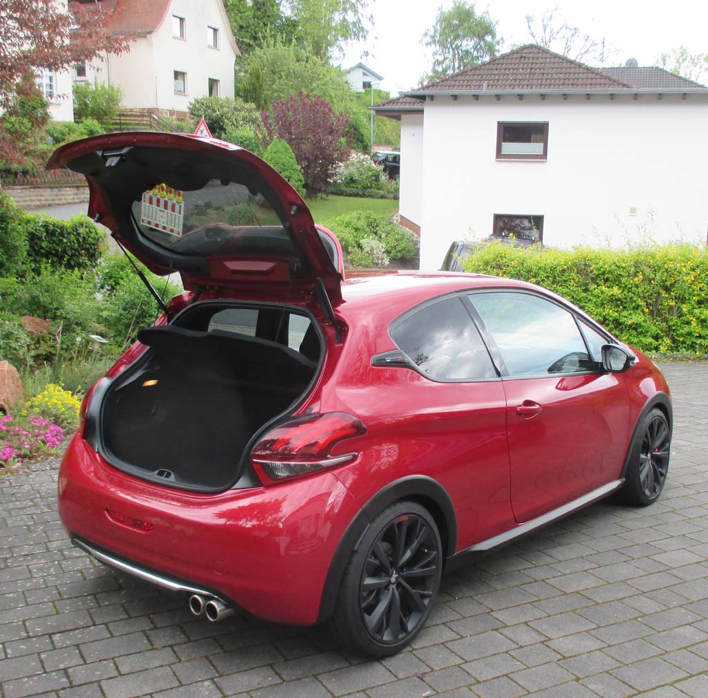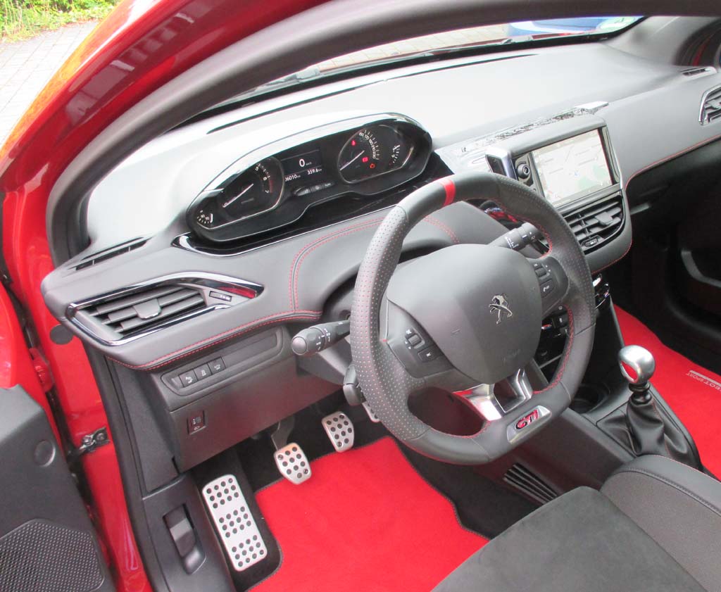 Die aktuelle Auflage der Normalversion, solide verarbeitet, für ihre Klasse standesgemäß anmutend, 3,97 Meter lang, Radstand 2,53 Meter, Kofferraum immerhin noch 285 bis 1076 Liter, steht seit 2015 bei den Händlern, tritt markanter auf. Als GTi by Peugeot Sport setzt der 208 etwa durch Frontspoilerlippe, breitere Radkästen, Seitenschweller, Doppelauspuffendrohr und 18-Zoll-Leichmetallräder mit 205er-Reifen, dazu etwa Polster aus Kunstleder und Alcantara mit roten Ziernähten, Pedale mit Aluminiumaufsatz und durch spezielle Schalensitze besondere sportliche Akzente. Im Fond geht es beengter zu. Die Rundumsicht ist okay, die Bedienung rasch im Griff. Vorsicht ist bei den beiden größeren Türen lediglich in engeren Parklücken und Garagen geboten!
