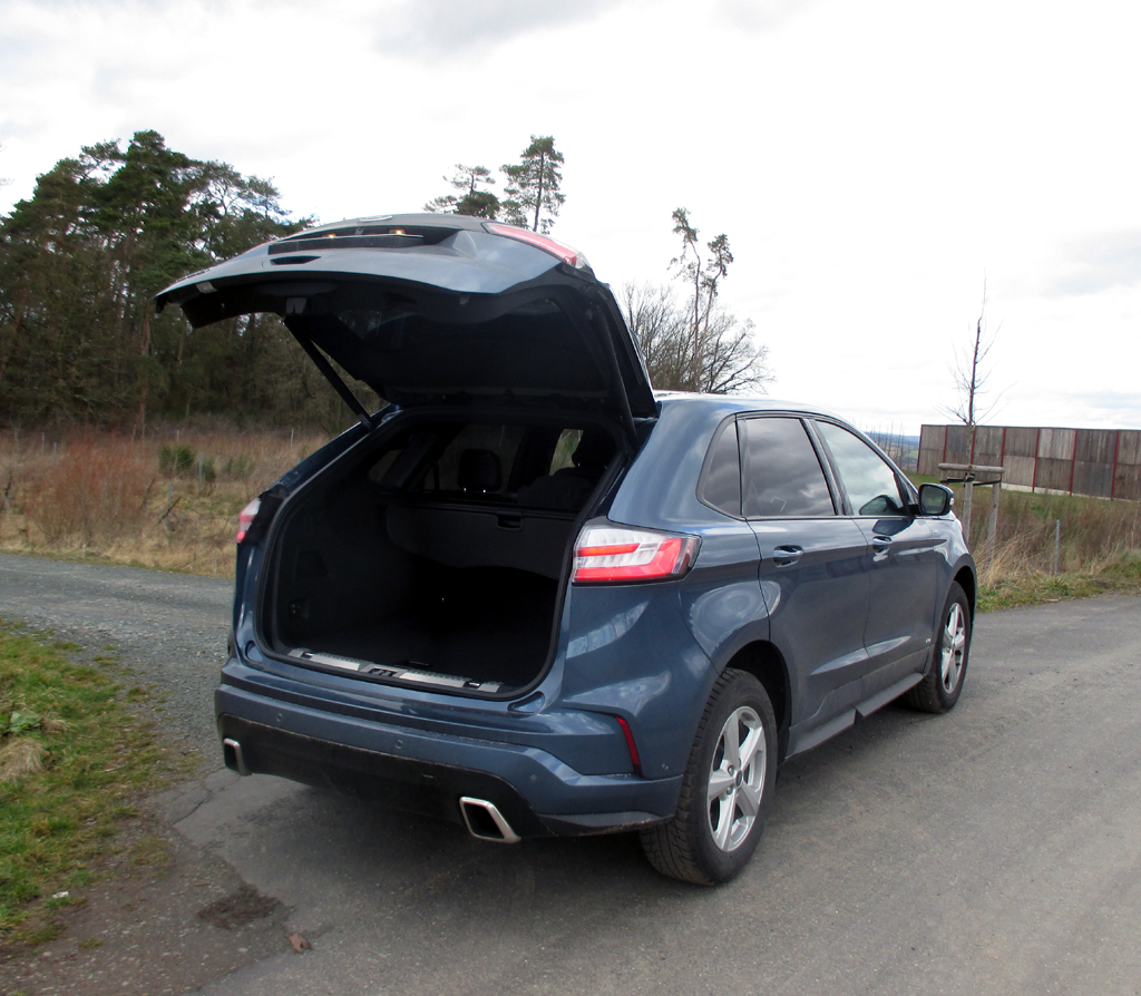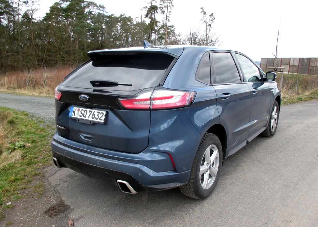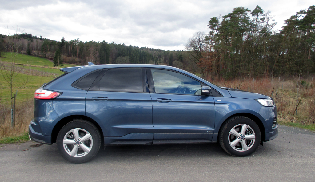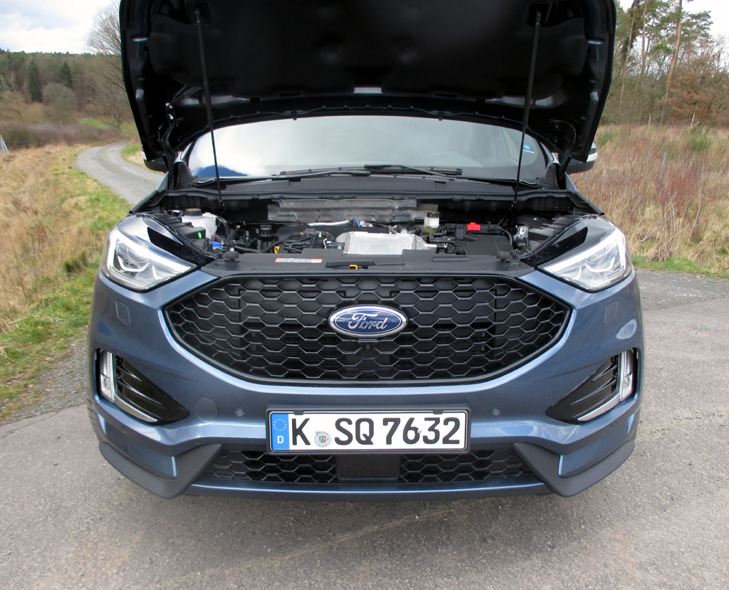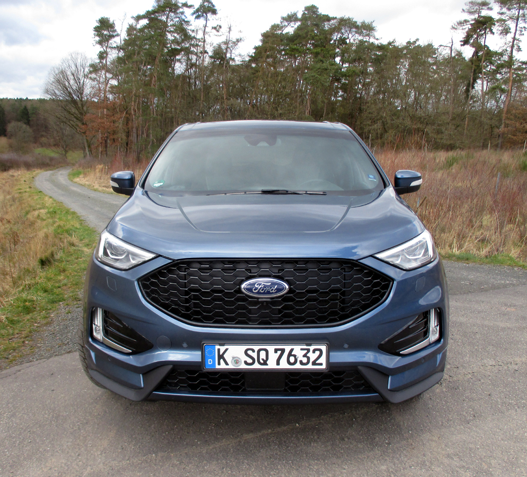 Der Biturbo schiebt den leer 2116 Kilo schweren Edge, der Lasten bis 2,2 Tonnen ziehen kann, insgesamt flott voran. Wirkt er zunächst etwas schwerfällig, geht er, einmal auf Touren, leichtfüßiger zu Werke, vermittelt ein erhabenes Fahrgefühl mit kaum Geräuschkulisse innen. Der Allrad ist mit permanent geregelter Drehmomentverteilung kombiniert. Das Fahrwerk im ST-Line ist ohne Tieferlegung sportlicher abgestimmt, federt aber immer noch ausreichend komfortabel. Die elektromechanische Servolenkung gibt direktere Rückmeldung von der Straße. Die Scheibenbremsen packen standfest zu. Fahrspur-, Fahrspurhaltehilfe, Distanzhalter, Müdigkeits-, Auffahrwarner, aktive Notbremsassistenz und Verkehrszeichenerkennung tragen bereits zum Standard-Insassenschutz bei.