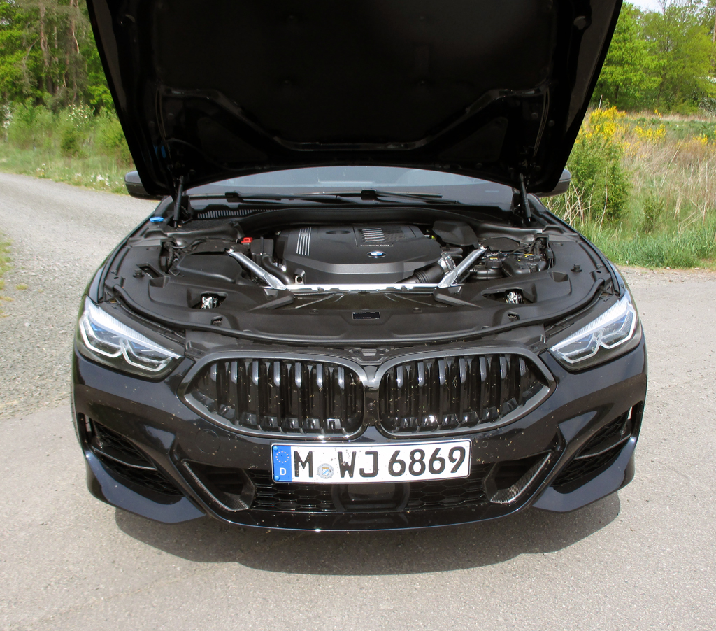 Der Twinpower-Turbo schiebt dieses leer doch 1930 Kilo schwere Gran Coupé beim Tritt aufs Gaspedal stürmisch voran, wobei sich die Kraft weitgehend gleichmäßig entfaltet. Das Adaptiv-M-Fahrwerk ist mit dynamischer Dämpferkontrolle kombiniert. Über den Fahrerlebnisschalter sind die Fahrprogramme Komfort, Eco Pro, Sport und Adaptive einstellbar. Der Permanentallrad verteilt die Drehmomente zwischen Vorder- und Hinterachse vollvariabel. Die Integral-Aktivlenkung passt den Lenkwinkel der Hinterräder an, sorgt so für agileres Fahrverhalten. Die im M-Sportpaket enthaltene Sportbremse ist auf höhere Leistung ausgelegt. Unter anderem Aufmerksamkeitsassistenz, Spurverlassens-, Spurwechsel-, Front-, Heckkollisions- und Querverkehrswarnung hinten tragen bereits zum hohen Standard-Insassenschutz bei.