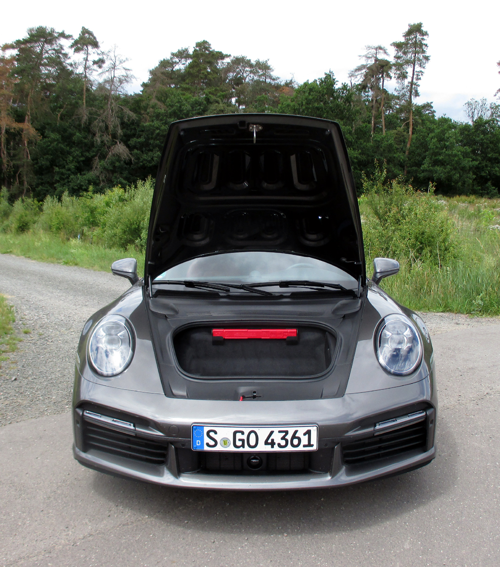 Das leer je nach Norm 1640/1715 Kilo schwere Turbo-S-Coupé mit automatisch ausfahrbarem Bugspoiler, Bugverkleidung mit seitlichen Lufteinlässen und Lufthutzen, aktive Kühlluftklappen und Spaltfügel stürmt beim Tritt aufs Gaspedal mit Vehemenz voran. Das Serien-Adaptivfahrwerk übertreibt es nicht mit Härte, lässt sich über Drive Mode jedoch extrem nachschärfen. Es gibt zudem einen speziellen Nassfahrmodus. Der Allrad ist kombiniert mit vollvariabler Momentenverteilung und Torque Vectoring Plus, um durch gezielte Bremseingriffe am kurveninneren Hinterrad Lenkverhalten- und Lenkpräzision bei dynamischerer Fahrweise so zu verbessern, dass man schneller und fahrstabiler selbst durch Kurven eilen kann. Die variabel übersetzte, mit Lenkimpuls versehene elektromechanische Servolenkung spricht direkt an. Die vorn und hinten innenbelüfteten Scheibenbremsen aus Keramik packen standfest zu. Im Testwagen haben unter anderem Warn-/Bremsassistenz mit integrierter Frontkamera, Umfeldbeobachtung, Abstandsregelung, Spurhalte-, Spurwechselhilfe und Verkehrszeichenerkennung schon zum Standard-Insassenschutz beigetragen.