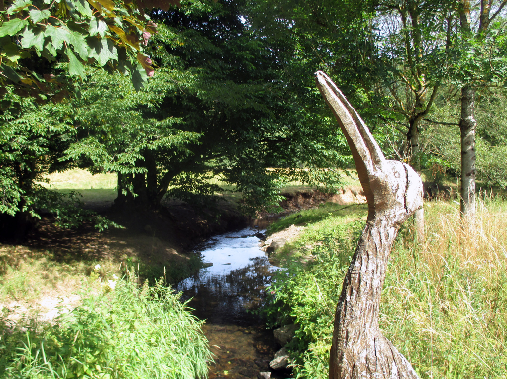 Hölzerne Vogelkunst am Wanderweg einer wildromantischen Hügellandschaft.