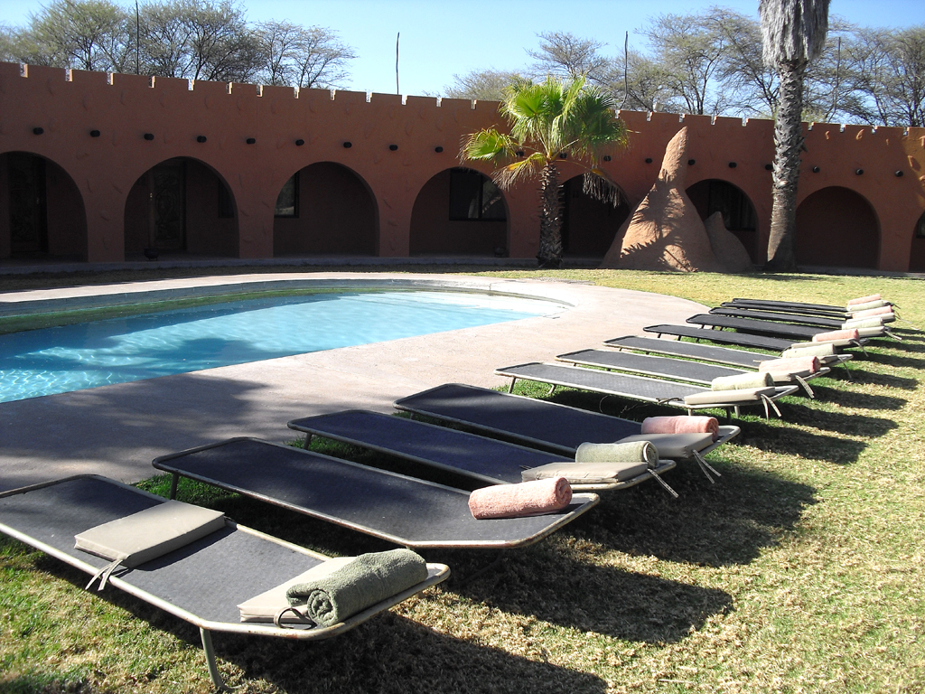 Die im afrikanischen Stil errichtete, luxuriöse Lodge selbst verfügt über mehr als 20 Zimmer, wobei sich die meisten in einem Garten sogar mit Flamingos um einen Pool herum gruppieren – mit Blick auf ein riesiges Wasserloch, in das sogar Flusspferde schnaubend verschwinden, wenn man ihnen zu nahe kommt. Kulinarisch geht es in der Lodge bis hin zu hausgemachten Würsten herzhaft-afrikanisch zu. Abends stehen rund ums Lagerfeuer, begleitet von Wein aus der Region im Süden Afrikas oder von namibischem Bier, ein Drei-Gänge-Menü mit heimischem Wildbret und/oder ein Dinner-Buffet mit Salatbar auf dem Programm.