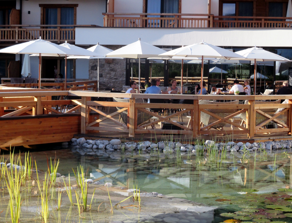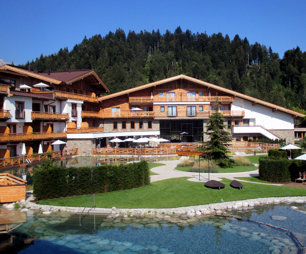 Unterbringung/Flair: Vor prächtiger Bergkulisse stehen 17 Doppelzimmer/Suiten, 4 Penthouses und 44 Appartements, 14 davon mit Zugang zu dem eigens angelegten, etwa 1300 Quadratmeter großen See, zur Verfügung, alle umfangreich ausgestattet. Die Einrichtung insgesamt von alpinen Altholzmöbel über Wohneinheiten mit eigenem Kräuter-, Farb-, Stoff- und Duftkonzept bis hin zum Smart-TV wirkt alpenländisch-behaglich und stilvoll-modern zugleich. Suiten und Appartements sind zudem zusätzlich mit stattlichen Kochmöglichkeiten bestückt. Trotz Größe und architektonischer Offenheit im „Zufluchtsort mit Heimatgefühl“ lassen sich immer noch genügend Nischen finden, sich zurückzuziehen.