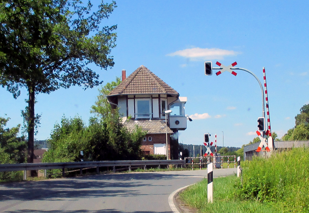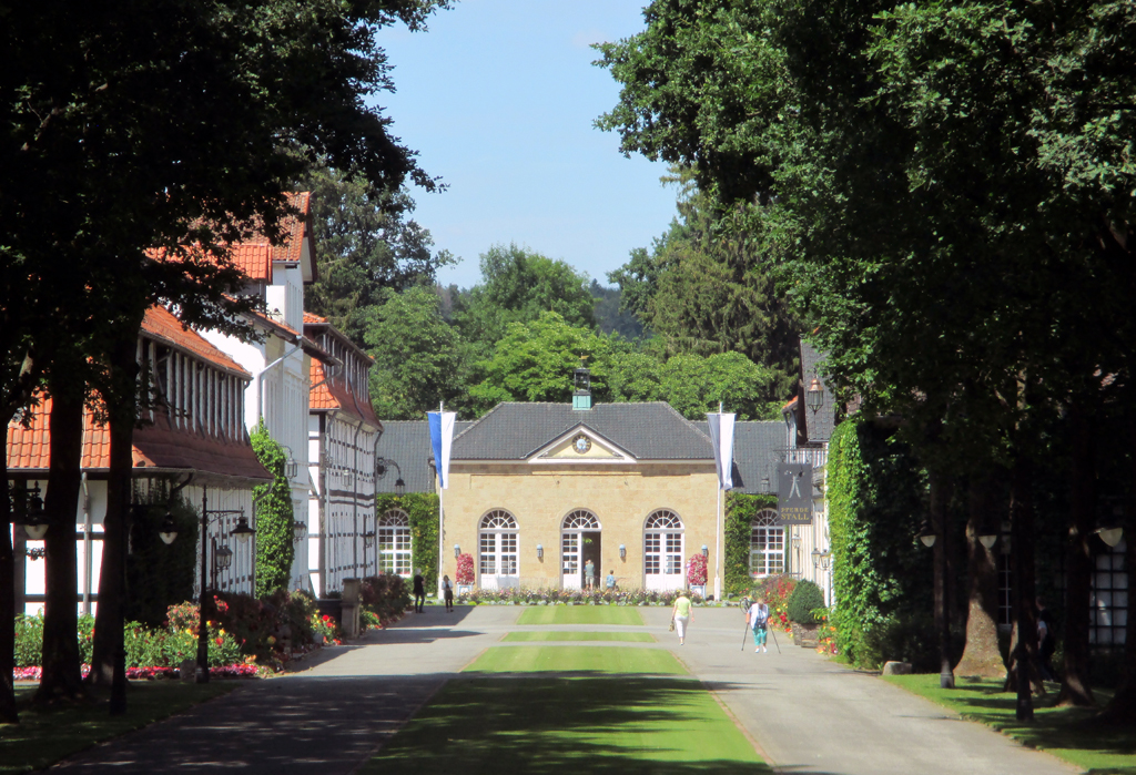 Ein ganz normaler Montag Mitte Juli. Die Sonne scheint. Es ist warm. Das Moor- und Mineralbad heißt die Besucher am Ortseingang auf Holztafeln willkommen. Wer wie wir von Süden kommend zum Gräflichen Park will, der muss am unten gemauerten, oben mit Fachwerk verkleideten Bahnhäuschen vorbei die Strecke Altenbeken-Kreiensen überqueren.