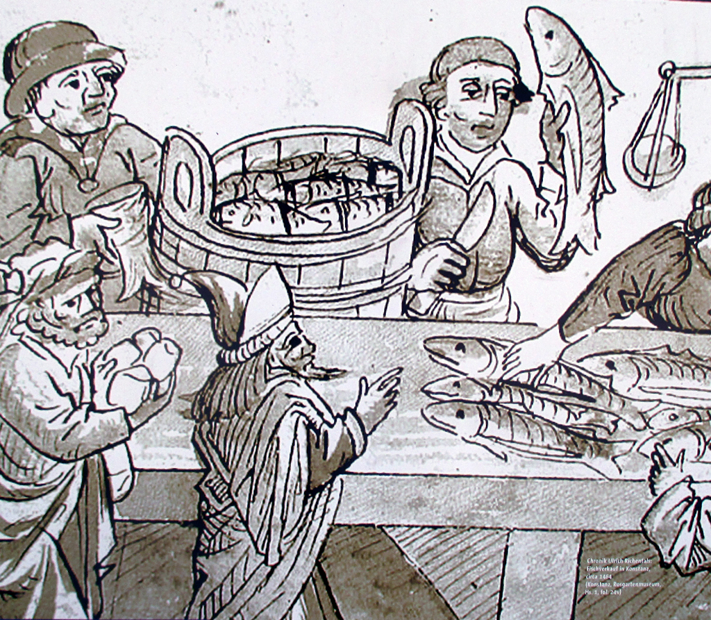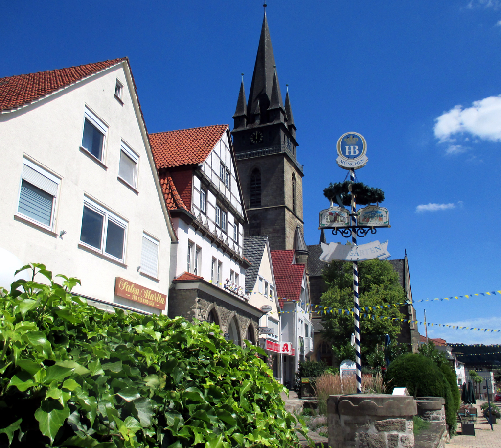 Wir haben noch Zeit, schauen uns im Zentrum um. In Nordrhein-Westfalen sind schon seit Ende Juni Ferien. Entsprechend beschaulich geht es in der Stadtmitte zu. Kaum Passanten in der Passage, die an der katholischen Pfarrkirche Peter und Paul vorbei hinunter in Richtung Rathaus führt. Eine bebilderte Informationstafel weist auf die Marktordnung früher hin.