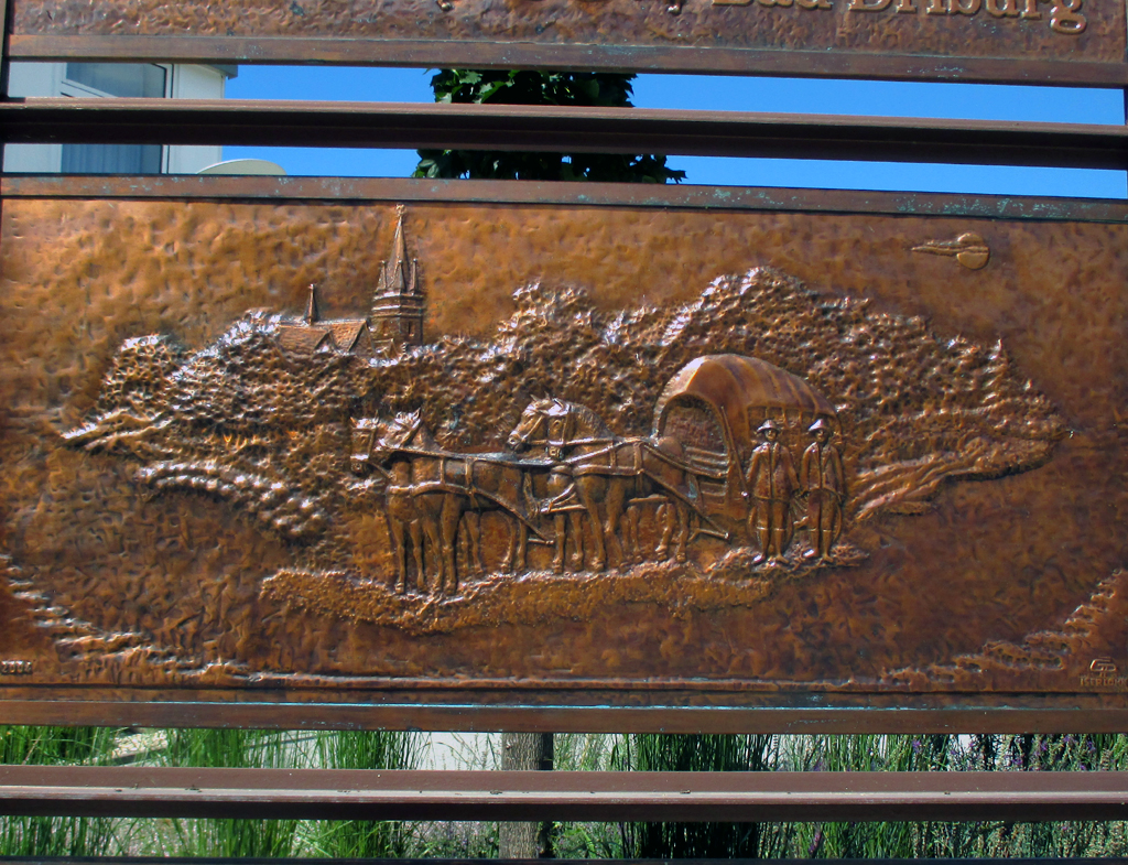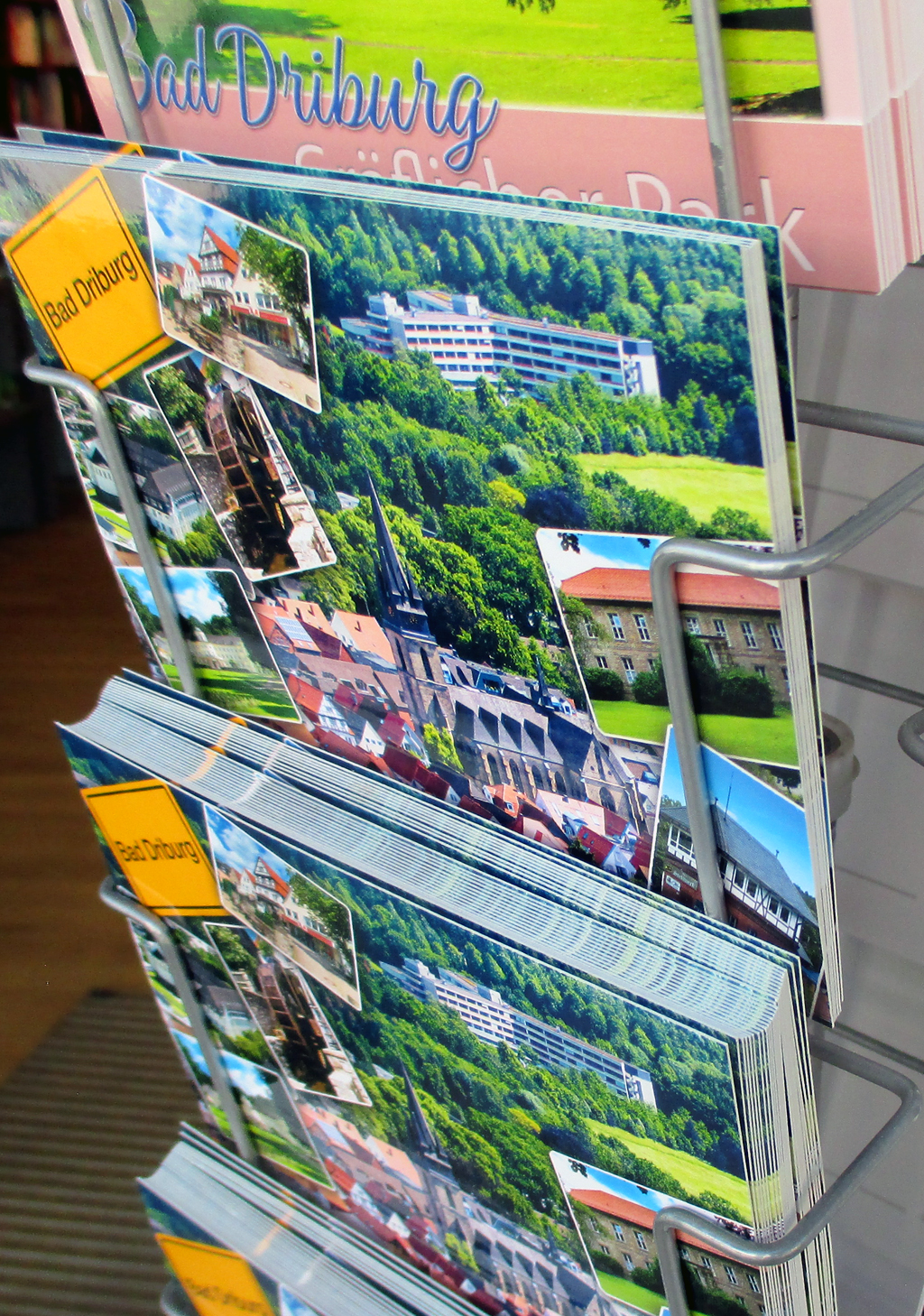 Wie vielfältig und bunt ein Ort sein kann, zeigen auch in Bad Driburg Souvenir-Postkarten in Drehständern vor einzelnen Läden, während unten am Kreisverkehr ein Kupferstich noch einmal auf die lange Glastradition verweist und zeigt, wie Driburger Glashändler damals auf Handelsreise quer durch das Land gezogen sind – mit Pferden und mit Planwagen.
