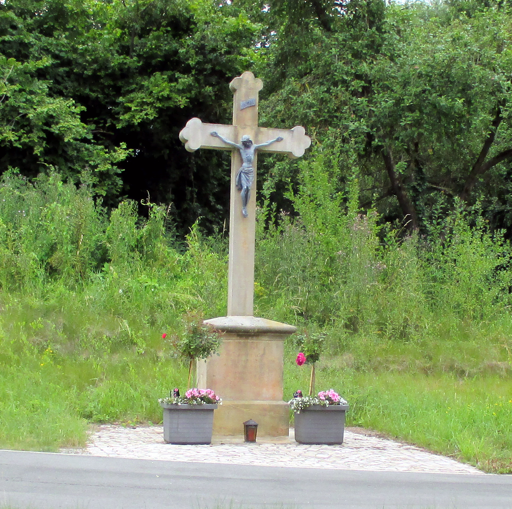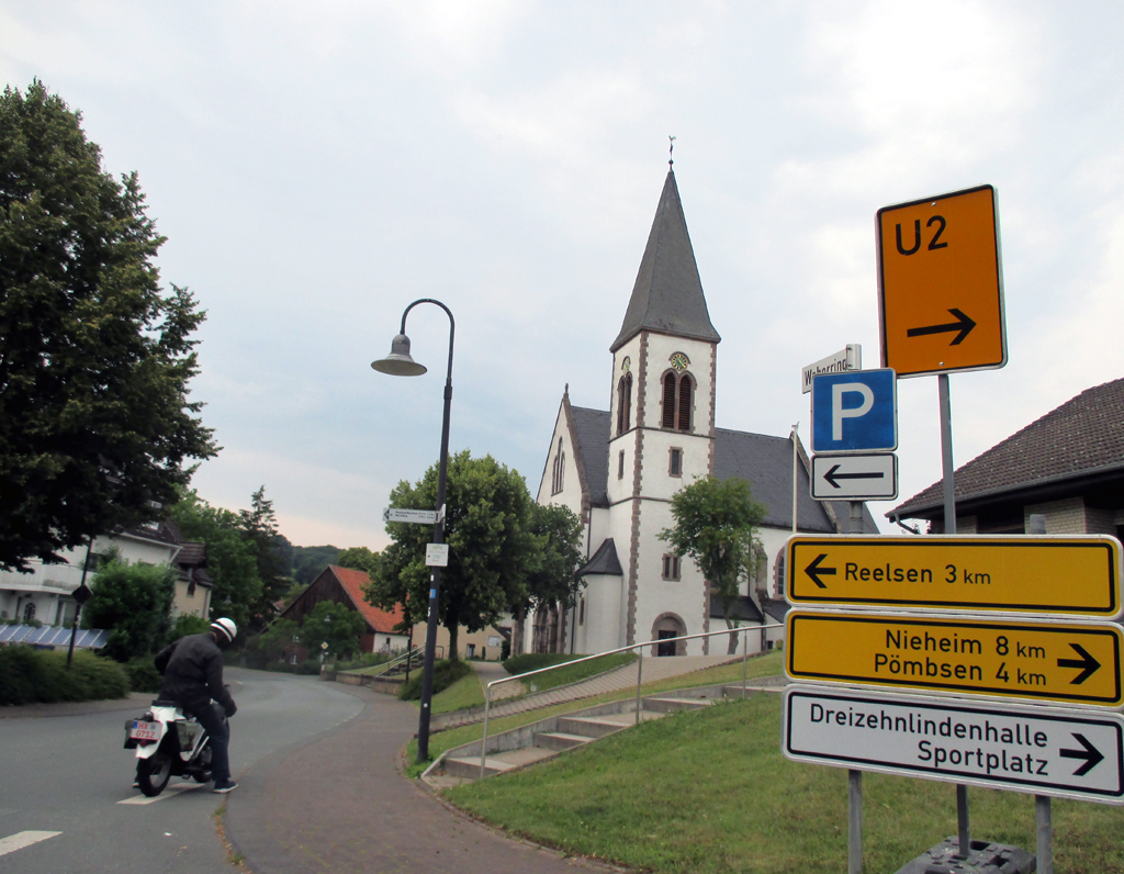 Zurück Richtung Bad Driburg. Die Gegend zwischen Teutoburger Wald und Weser ist noch stark ländlich geprägt. Es wechseln sich Dörfer mit Feldern, Wiesen und Wäldern ab. An einem Kreisverkehr steht ein Kreuz, das sicher nicht nur die Verkehrsteilnehmer schützen, sondern in Nordrhein-Westfalen wohl auch den katholischen Glauben bezeugen soll.