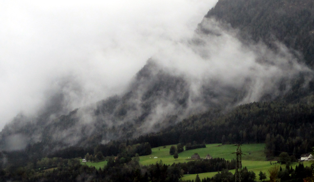 Die A9 Richtung Graz führt in die Steiermark. Wolken wabern tief um die bewaldeten Hügel.