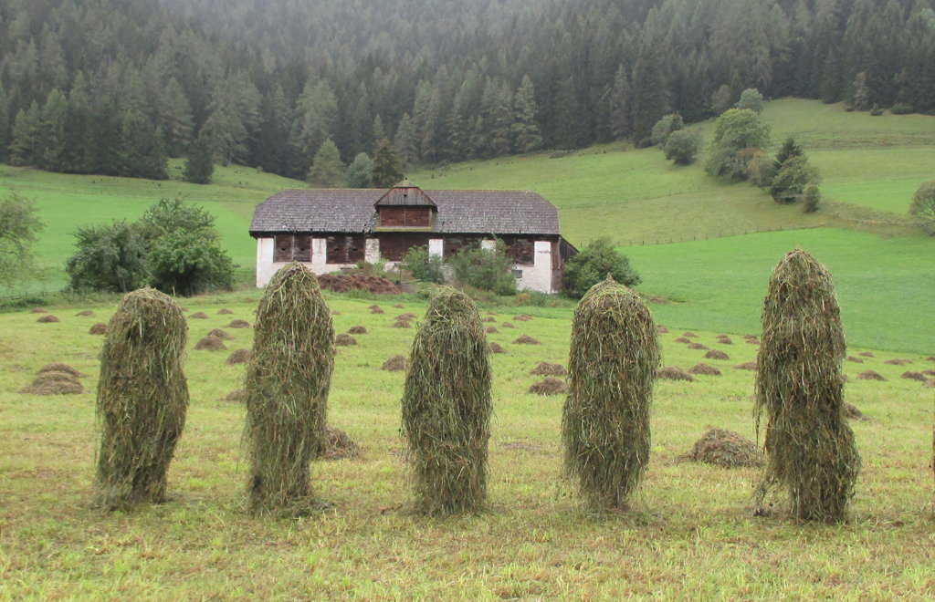 Heu scheint aufgerichtet besser zu trocknen. Die Mühle klappert auch bildlich am rauschenden Bach.