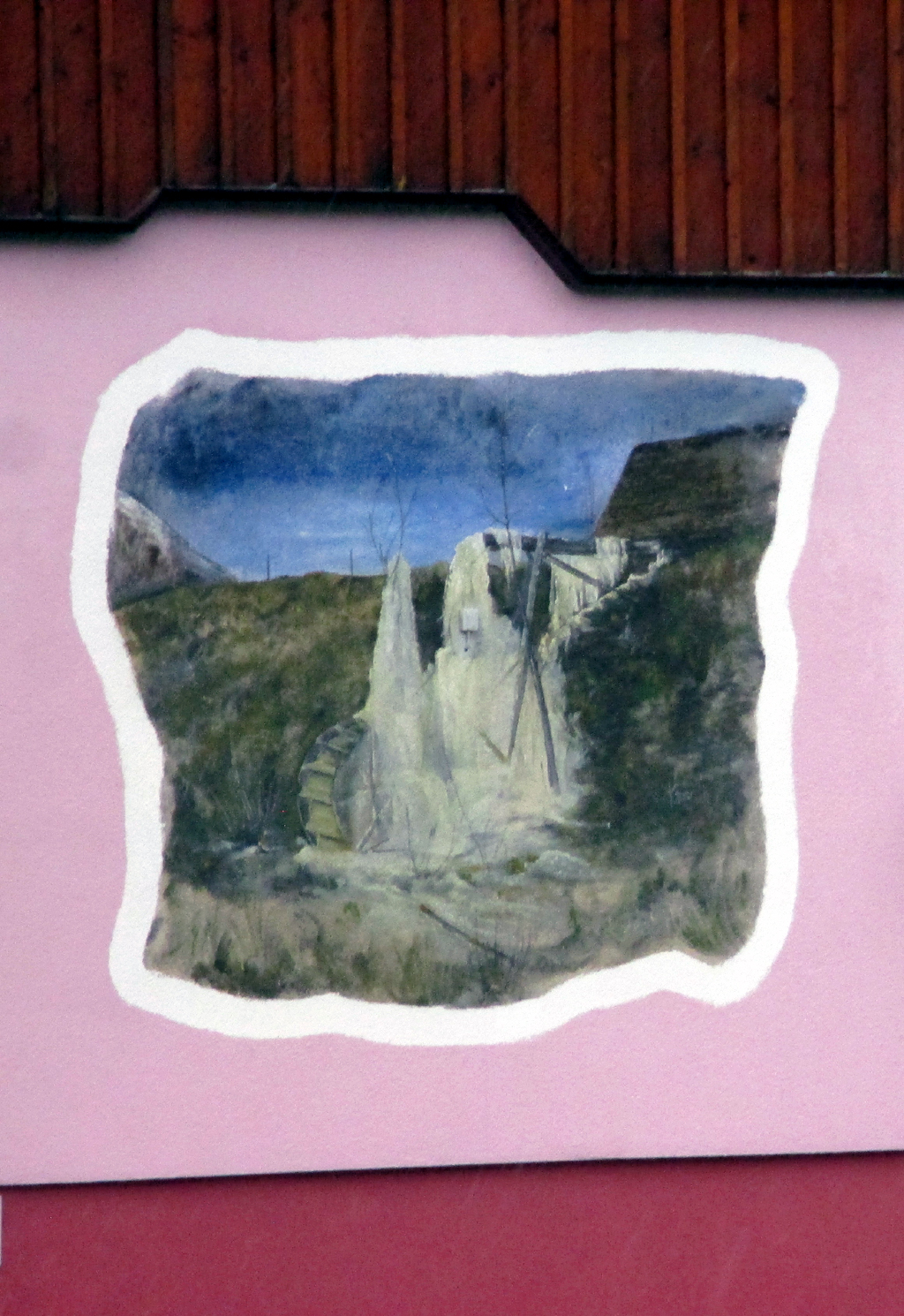 Fassadengemälde in Judenburg. Die Lorenbahn deutet auf den Kohleabbau in Fohnsdorf hin.