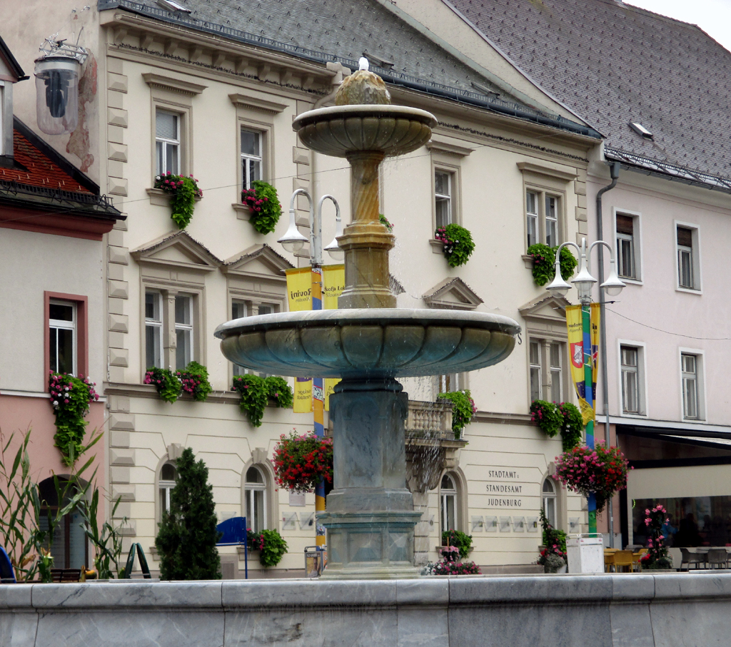 Auch Kühe gehören zum ländlichen Bild. Ein Brunnen ziert Judenburgs malerischen Hauptplatz.