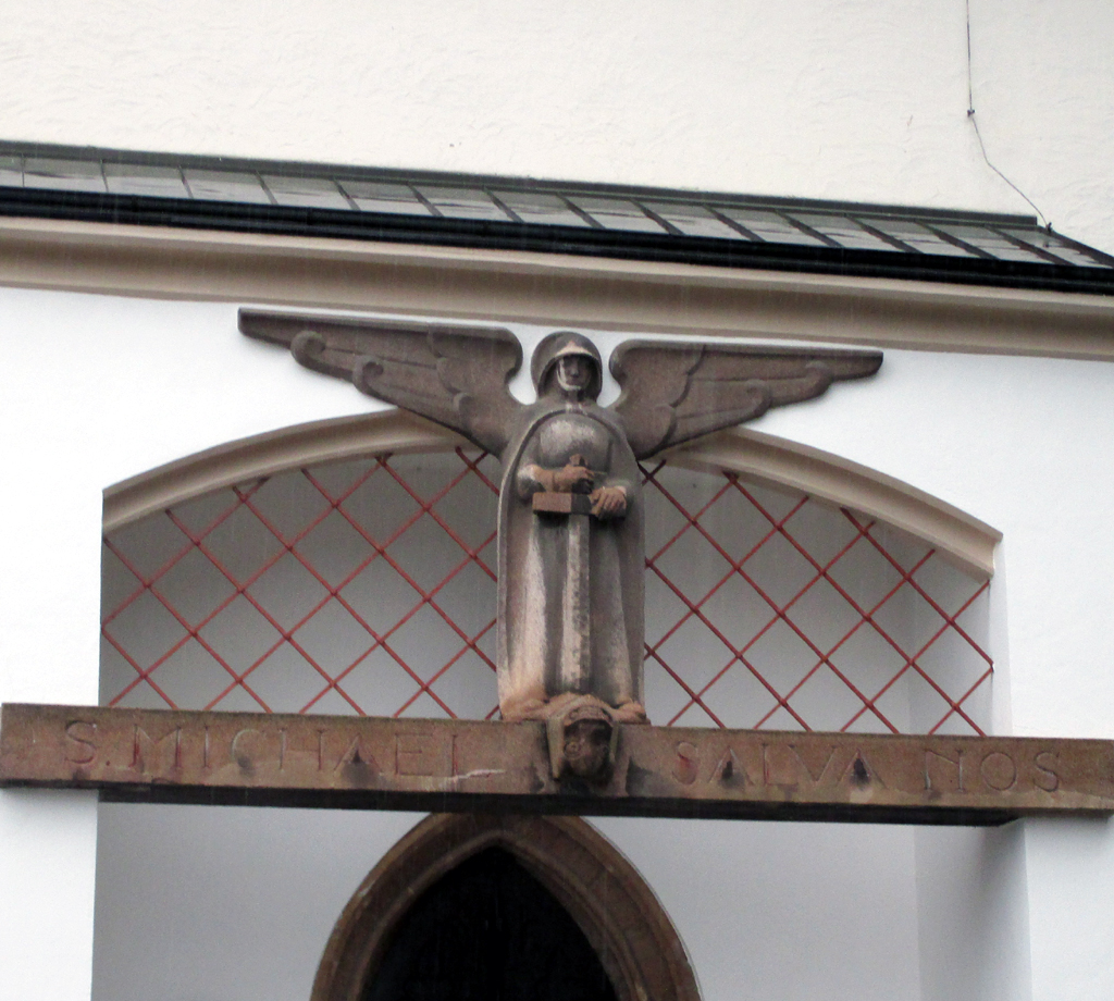 Sankt Michael wacht am Eingang der Kirche in Fohnsdorf. Die Wolkenschwaden wollen nicht weichen.
